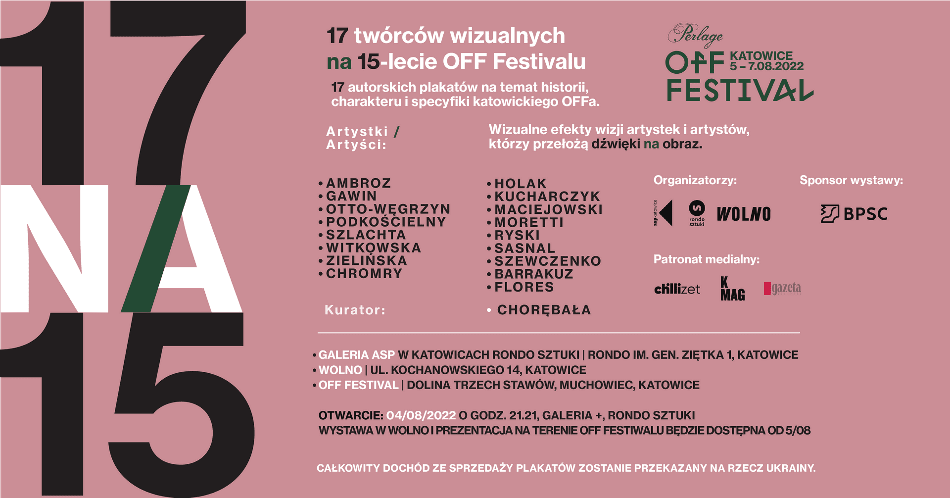 Wystawa będzie prezentowana w trzech lokalizacjach – Galerii +, WOLNO oraz na terenie OFF Festiwalu. Artystki i artyści biorący udział w wystawie: Joanna Ambroz, Beata „Barrakuz” Śliwińska, Marta Gawin, Bogna Otto-Węgrzyn, Patrycja Podkościelny, Bianka Szlachta, Ania Witkowska, Ada Zielińska, Bolesław Chromry, Basia Flores, Mateusz Holak, Wojtek Kucharczyk, Marcin Maciejowski, Macio Moretti, Dawid Ryski, Wilhelm Sasnal, Vasilij Szewczenko. Plakaty w limitowanej ilości są przeznaczone do sprzedaży, a całość dochodu ze zbiórki ma zostać przekazana na pomoc Ukrainie.