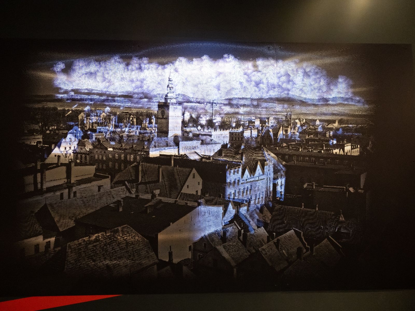 Zwiedzając wystawę „1945. Nie koniec, nie początek”, jeżeli zatrzymamy się w zaznaczonym miejscu, na ścianach uruchomią się obrazy przedstawiające synagogę, widok miasta i sceny z budowy.