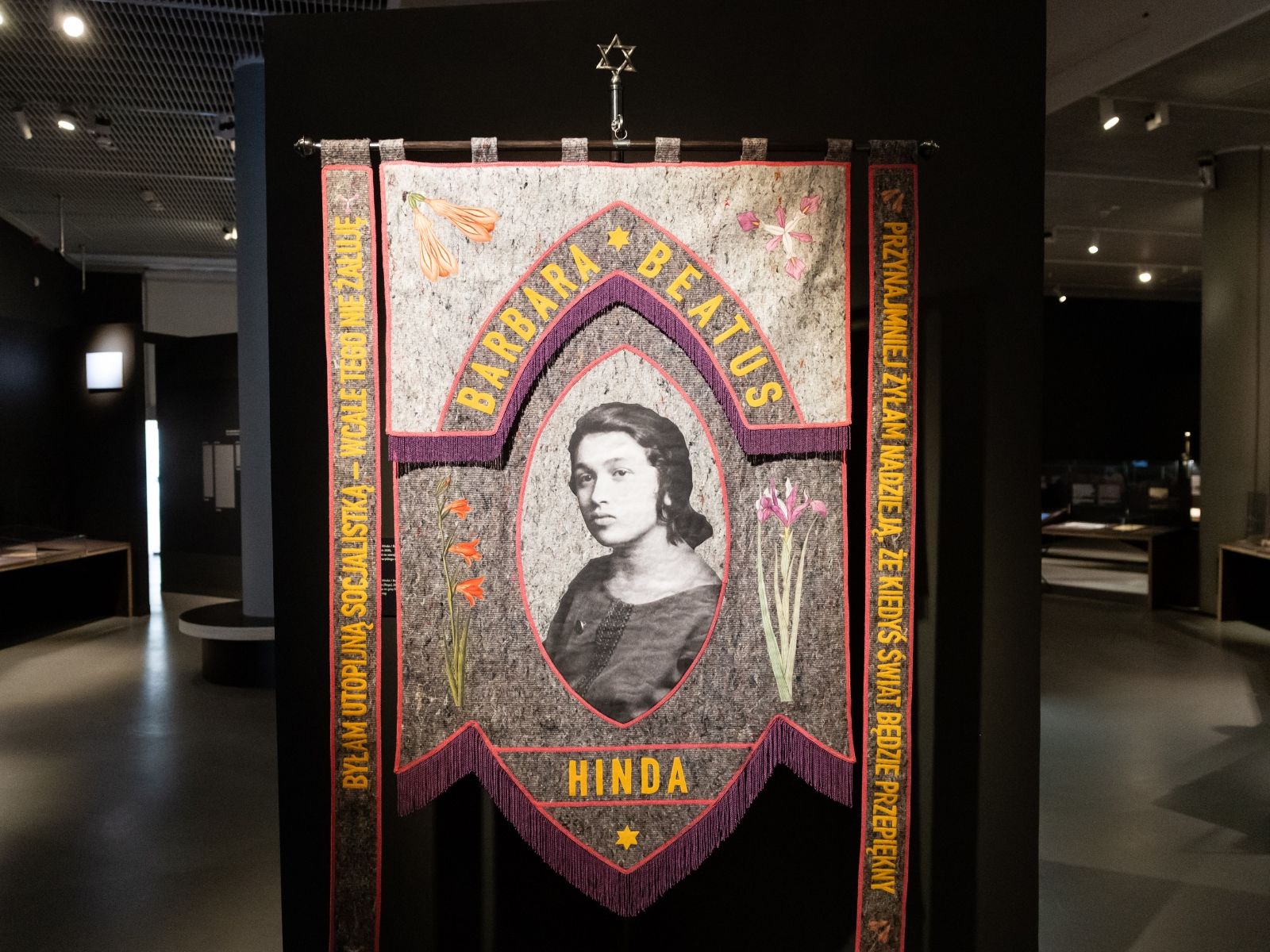 Na tkaninie bazuje również praca Zuzanny Hertzberg. Z szarej „szmaty” – wykorzystując wieloznaczność tego pojęcia (w języku jidysz słowo „szmate”, tak jak w języku polskim, jest rodzaju żeńskiego), stworzyła sztandar na wzór chorągwi maryjnych. Umieściła na niej jednak nie świętą, lecz jedną z bohaterek wystawy.