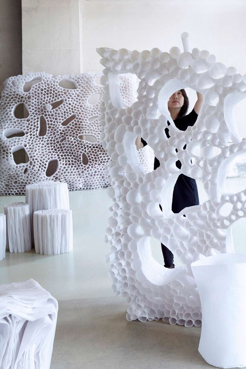 Trudno uniknąć zdumienia kiedy patrzy się na oryginalne struktury, wychodzące spod ręki Pao Hui Kao. Precyzyjnie budowane formy to także eksperyment badawczy młodej artystki, która pragnie znaleźć nowe połączenia pomiędzy rzeczą, ciałem, a systemem recyklingu. Pao powiedziała nam, że podróżując poprzez rozwój używanych materii, nauczyła się szacunku względem ich jakości. Nie zmienia na siłę kształtów czy faktur, a zamiast tego pragnie w pełni wyeksploatować i ukazać ich naturalny wdzięk.