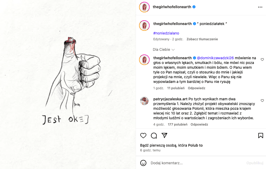 Wybory w swoim stylu skomentowała zaangażowana w aktywistyczne działania graficzka Matylda Damięcka. Opublikowała ona na swoim profilu na Instagramie grafikę, która przedstawia dłoń z uciętym kciukiem.