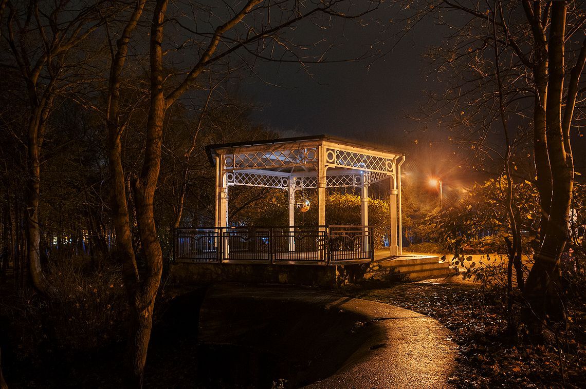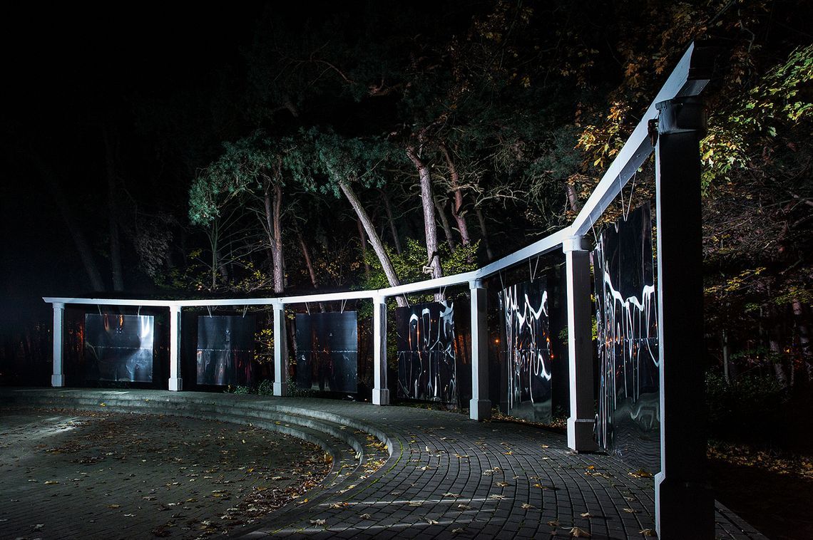 Instalacja Adama Gołębiewskiego "In Front Of Their Eyes II" wkomponowana została w malowniczą kolumnadę w Parku Brzeźnieńskim. Miedzy kolumnami zawisły wielkie stalowe płaszczyzny (głośniki), z których dobywał się dźwięk. Stal odbijała zniekształcony obraz, tworzyły się na niej refleksy. Kolumnadę oświetlały mocne reflektory. Lampy i amfiteatralny układ małej architektury tworzyły złudzenie teatru. Główną rolę grała w nim poruszająca, pełna emocji, eksperymentalna muzyka. Prezentowana w ten sposób kompozycja to suma sześciu ciągle zmieniających się oddechów zdeponowanych w przedmiocie. Kolejne warstwy znaczeń zawartych w instalacji wynikają ze zderzenia żywiołów wody i powietrza – morza i wiatru, tak bliskiego fali dźwiękowej – które, zwłaszcza jesienią, tworzy naturalne, surowe tło dla tej szczególnej konstrukcji. "In Front of Their Eyes II" łączy w sobie pierwotne pragnienie dźwięku, życiodajny oddech, ale też wyjątkową formę prezentacji nawiązującą do starożytnych amfiteatrów – czytamy w opisie arcyciekawego dzieła sztuki.