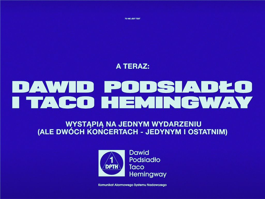To może być największe wydarzenie koncertowe w Polsce tego roku, przynajmniej jeśli chodzi o rodzimych artystów. Sony Music, wydawca Dawida Podsiadły, wydało oficjalną zapowiedź wspólnego koncertu swojego podopiecznego i Taco Hemingwaya. "Dzieli ich niewielka różnica wieku i pozornie, gatunki muzyczne, w obrębie których się poruszają, ale na pewno łączy uznanie fanów, krytyków i ogrom nagród" - pisze organizator.
