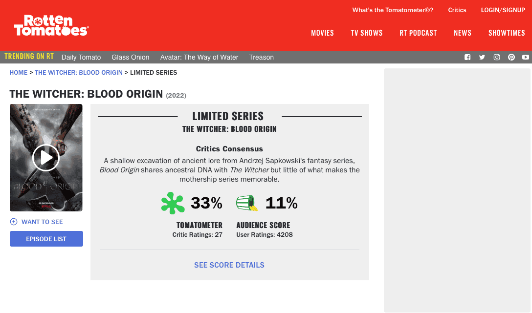 Akcja prequelu toczy się ponad tysiąc lat przed wydarzeniami z „Wiedźmina”. Siedmioro wyrzutków ze świata elfów podejmuje krwawą walkę przeciw niepowstrzymanej sile. „Wiedźmin: Rodowód krwi” jest obecnie najchętniej oglądanym serialem na Netflixie, ale zbiera fatalne recenzje. Do tej pory produkcja zgromadziła 35 proc. pozytywnych recenzji na Rotten Tomatoes oraz zaledwie... 11 proc. pozytywnych opinii widzów. Nie lepiej sytuacja wygląda na IMBD (4,1/10).
