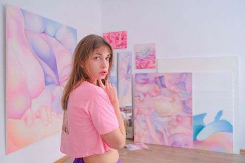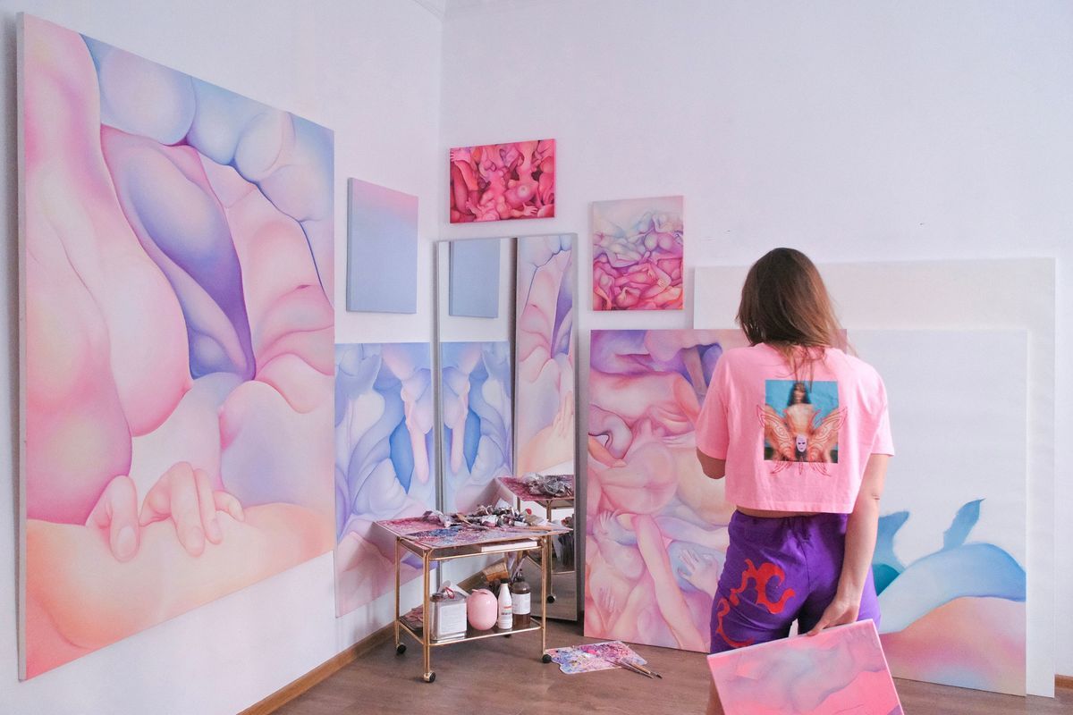 Agata Przyżycka „Delikatne kolory płowieją w słońcu”Miękkie przejścia tonalne, gradienty i rozświetlone płaszczyzny budują aurę pastelowej ekstazy. Cukierkowa estetyczność i dekoracyjność obrazów artystki okazują się jednak zwodnicze. Pod powierzchnią delikatnych barw kryje się pewna biologiczna konkretność: ciała przeciekają, sklejają się, tracą kontury; są pożądliwe, zachłanne, namiętne. Manifestują swoją materialność. Skłębione na płótnach formy często przypominają pejzaże – fale, pasma górskie, złożone struktury organiczne.