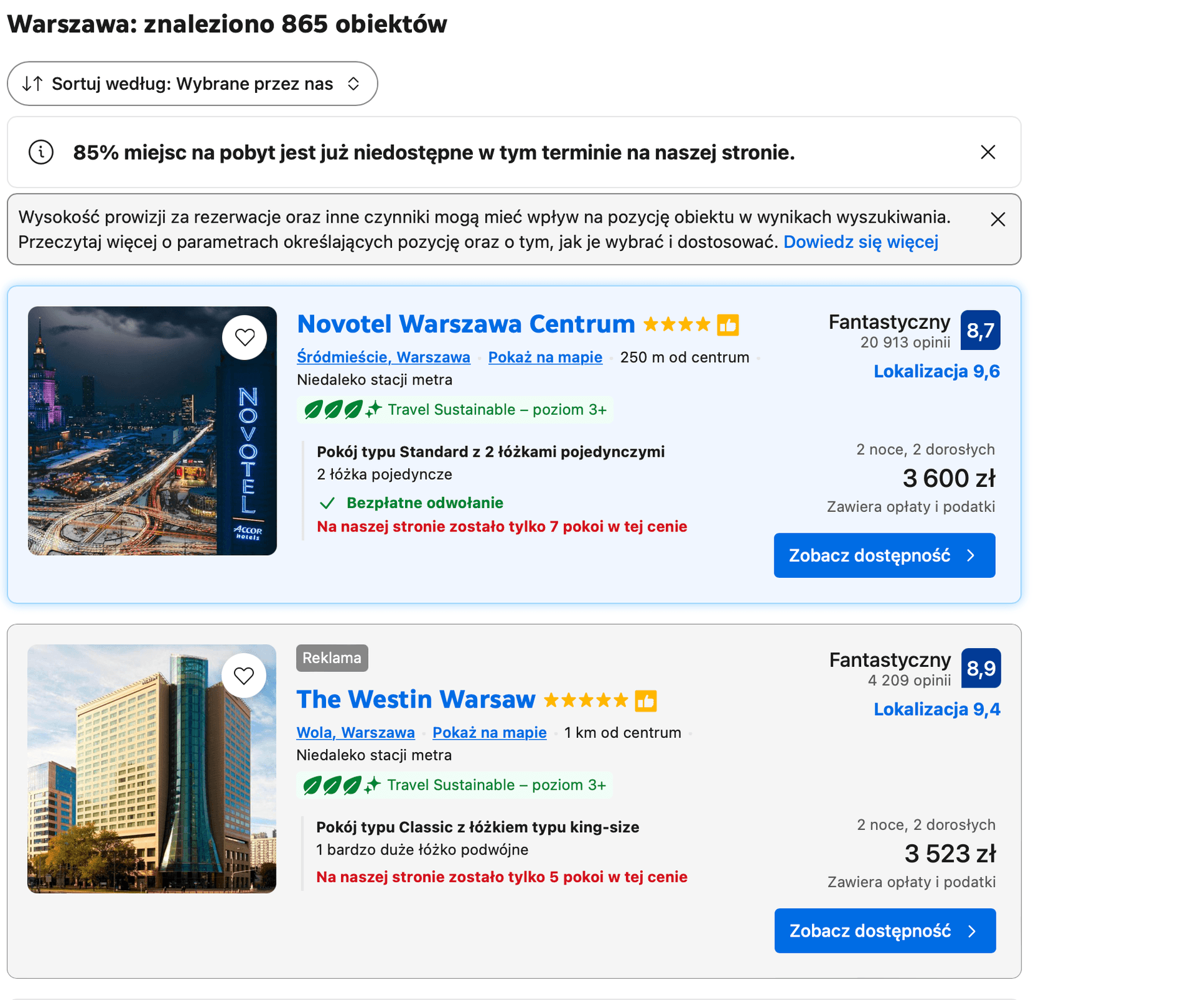 Na przykład na ulicy Grzybowskiej cena za pierwszy termin wynosi 1 258 zł, podczas gdy za drugi aż 8 998 zł. To prawie ośmiokrotna różnica. Za pobyt w hotelu Novotel, położonym w samym centrum Warszawy, ceny wahają się od 799 zł do 3 600 zł. Natomiast za pobyt w Dedek Park, w Parku Skaryszewskim tuż obok Stadionu Narodowego, ceny wahają się od 928 zł do 6 000 zł.