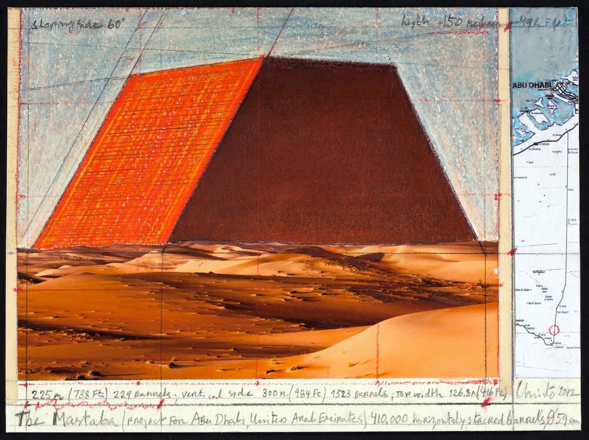 The Mastaba of Abu Dhabi (Project for Abu Dhabi, United Arab Emirates), Collage 2012: 21.5 x 29.2 cm, Pencil, charcoal, wax crayon, enamel paint, pastel, photograph by Wolfgang Volz, and tape on brown board, Photo: André Grossmann, © Christo 2012