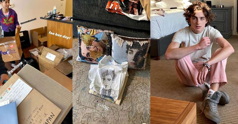 Pierwsze zdjęcie pokazuje Timothée w otoczeniu niezliczonych paczek i listów, w tym jednego pochodzącego z Japonii, którego autor uprzejmie prosi aktora o autograf, o ile „nie jest to zbyt duży kłopot”.