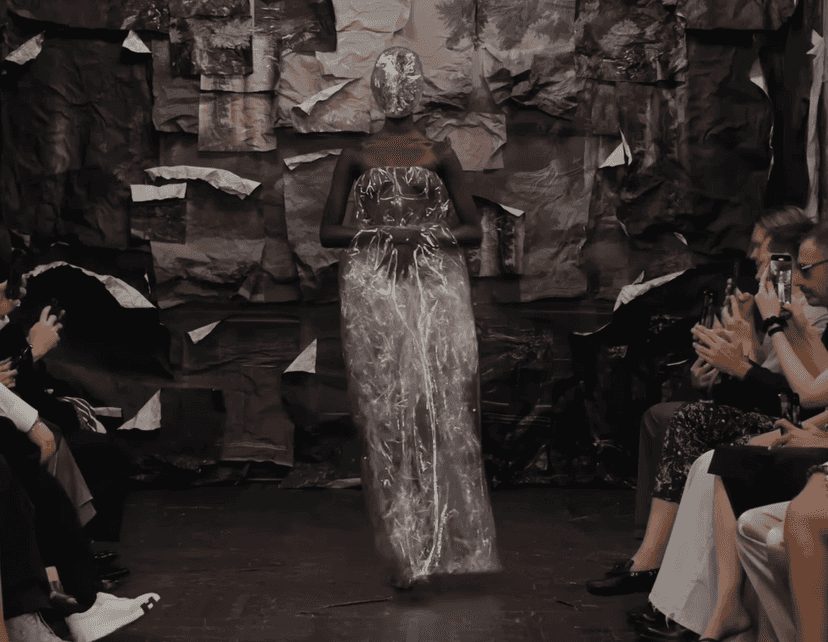 Weźmy choćby look numer 4: suknia przypominała pociągnięcia pędzla Gustave’a Moreau, a wewnątrz kołnierza wkomponowano martwe zapasy biżuterii z kryształów w odcieniach srebra i beżu. Ubrania, które na pierwszy rzut oka wyglądają na poskładane z resztek, stają się najbardziej ekskluzywnym produktem marki — bo w rzeczywistości są efektem setek godzin pracy, ręcznych technik i konceptualnej dyscypliny. To złudzenie, ale precyzyjnie kontrolowane i pełne znaczeń.