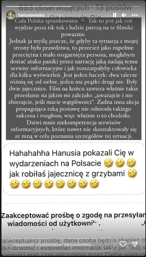Co ciekawe, Hanusia twierdzi, że to był prank. „Jest jeden ma haczyk: dwa telerze różnią się od siebie, jeden ma prążki, drugi nie. Film na końcu zawiera takie przesłanie, na jakim mi zależało: „uważajcie i nie zbierajcie, jeśli macie wątpliwości”. Żadna inna akcja propagująca taką postawę nie odniosła takiego sukcesu i rozgłosu, więc właśnie o to chodziło” – przekonuje influencerka.