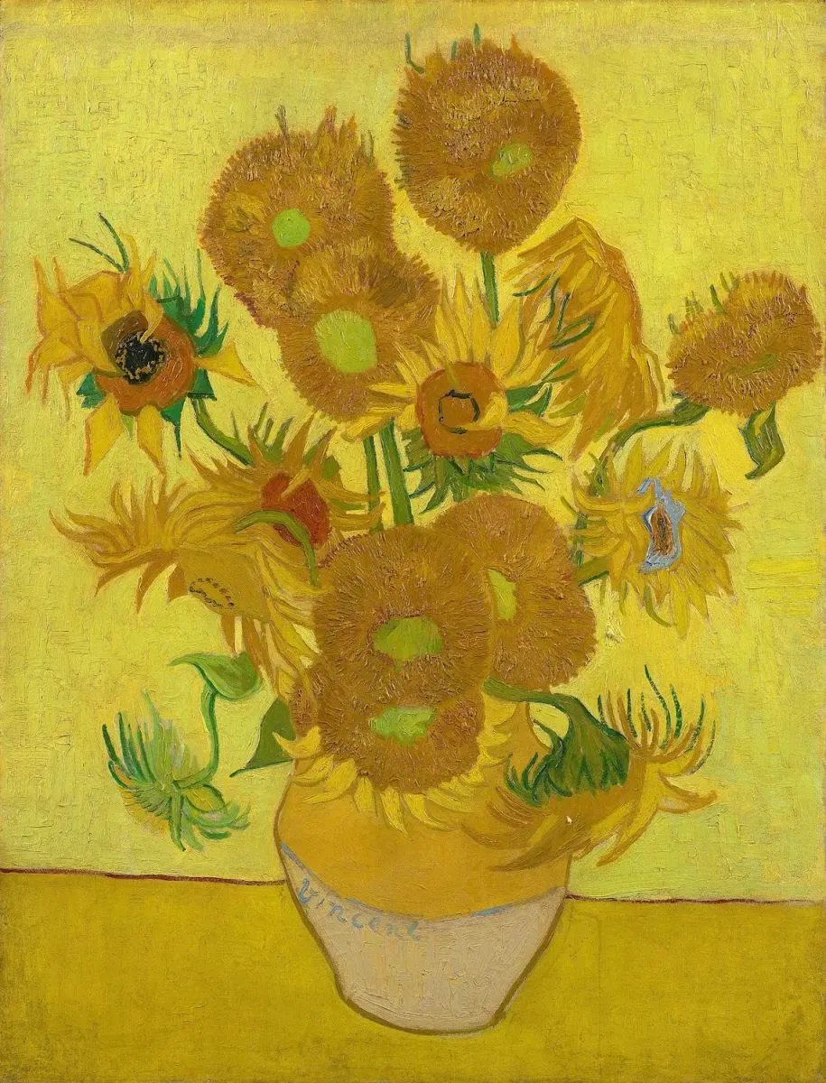Vincent van Gogh stworzył kilka martwych natur ze słonecznikami. Wybrana wersja przedstawia żółte kwiaty w żółtawym wazonie, umieszczone na żółtym stole na tle żółtej ściany. To zestawienie niezwykle piękne – obraz emanuje nastrojem gorącego, letniego popołudnia. Słoneczniki uchwycono w różnych fazach cyklu życia, więc niewiele z nich znajduje się w stadium, które można uznać za ideał słonecznika funkcjonujący w powszechnej świadomości – z intensywnie żółtymi płatkami, czerwonawo-brązowym środkiem i zielonymi liśćmi.