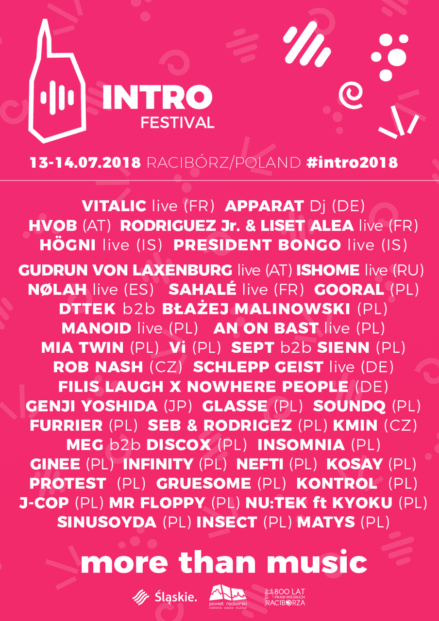 Choć 50-tysięczny Racibórz nie kojarzy się jako mekka elektroniki, to za sprawą festiwalu INTRO już po raz piąty przyjadą tu największe gwiazdy tego gatunku. W murach średniowiecznego, odremontowanego Zamku Piastowskiego, 13 i 14 lipca, na trzech scenach zobaczymy takich artystów jak Vitalic, Apparat (połowa Moderata), HVOB oraz Hogni i President Bongo (obaj z dawnego składu GusGus). Łącznie wystąpi prawie 50 artystów. Wśród atrakcji mapping 3D kaplicy zamkowej z 1288 roku. Jak zapowiadają organizatorzy, możemy się spodziewać miksu sztuki nowych mediów, technologii, malarstwa, graffiti i tatuażu.