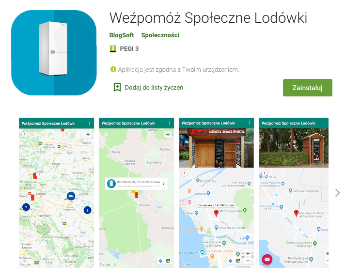 screen aplikacji Weźpomóż Społeczne Lodówki