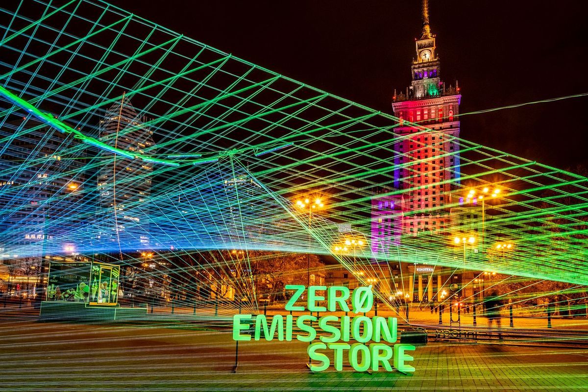 Zero Emission Store to instalacja z włóczki i światła, zasilana panelami fotowoltaicznymi, której autorem jest Sławomir Brzoska. Artysta, performer, podróżnik, profesor sztuk plastycznych, który znany jest z instalacji tworzonych przy użyciu sznurka, włóczki, światła UV, tak opisuje swoje działania: