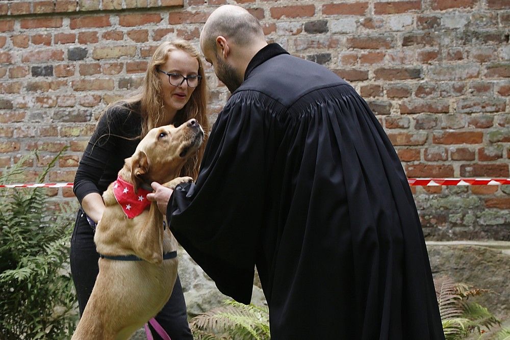 Chwilę po nabożeństwie do Kościoła wprowadzono ok. 5 letniego psa, Krisa, który ma niedoczynność tarczycy. Na co dzień przebywa na Wydziale Medycyny Weterynaryjnej UWM pod opieką inicjatywy Mokre Nosy. To nie pierwsza próba znalezienia domu Krisowi - w lipcu Dąbrowska założyła mu konto Tinderze w ramach akcji „Pokochaj Psiaka Bezdomniaka". Być może dzięki uczestnictwie w mszy w Łęgutach Krisowi w końcu uda się znaleźć kochającą rodzinę.
