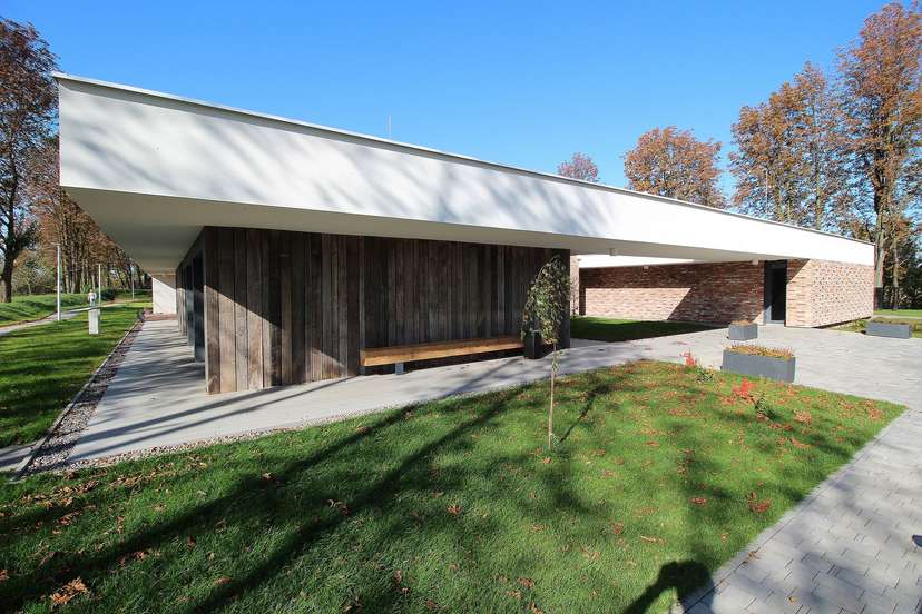 Duży parterowy budynek z pofalowanym dachem dobrze komponuje się z okolicznymi polami i pagórkami. Nie widać go z drogi, boukryty jest za starymi drzewami rosnącymi wokół byłego szkolnego boiska.