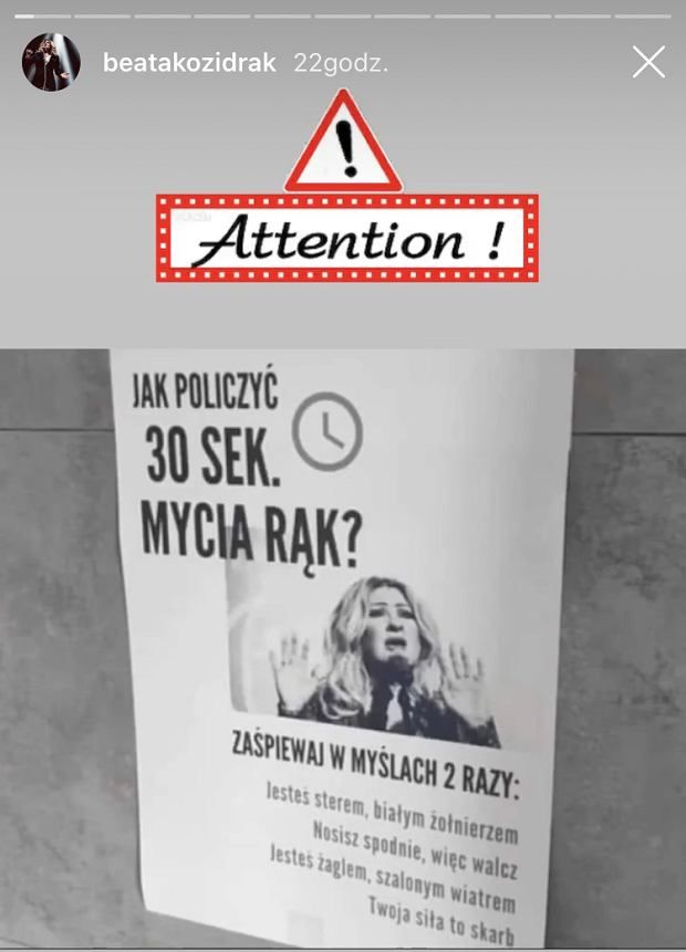 W ostatnim czasie viralem stała się humorystyczna instrukcja mycia rąk z wykorzystaniem hitu zespołu Beaty Kozidrak. Zdjęcie dotarło do samej piosenki, która chętnie zademonstrowała swoim wielbicielom, w jaki sposób należy prawidłowo myć ręce. Jak można się domyślić, video szybko stało się hitem internetu.