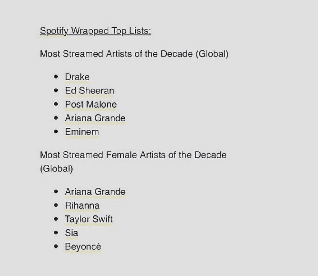 Chociaż nieustannie słyszymy o kolejnych rekordach, które ustanawiają artystki takie jak Taylor Swift, Rihanna czy Beyoncé, słuchano ich o wiele rzadziej, niż kolegów z branży. Liczby nie pozostawiają wątpliwości również w przypadku najchętniej odtwarzanych piosenek dekady wg Spotify Wrapped 2019, gdzie królował "Shape of You" Sheerana, "One Dance" Drake'a, "Rockstar" Post Malone'a czy "Closer" Halsey i Chainsmokers.