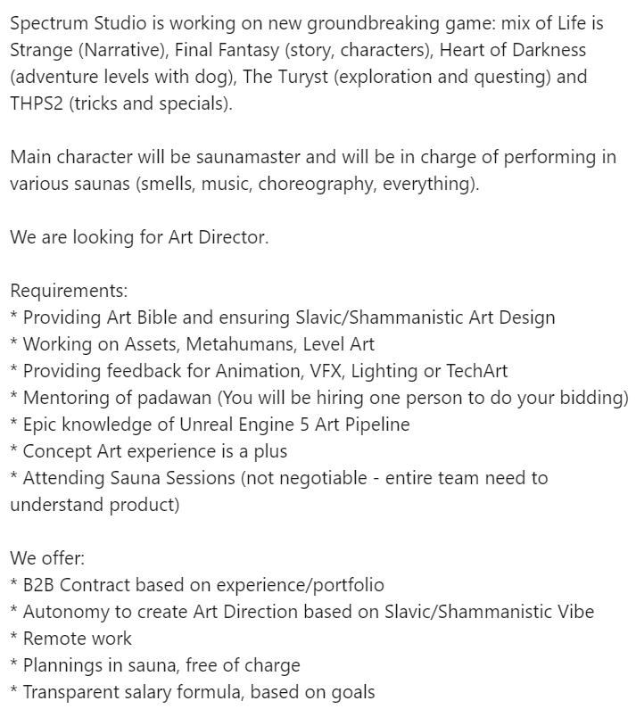 Jeden z komentujących udostępnił pod postem Chmielarza screen oferty pracy w Spectrum Studios, gdzie jednym z wymagań jest uczestniczenie w sesjach w saunie. Obok znajduje się dopisek, że ten podpunkt nie podlega dyskusji, ponieważ „cały zespół musi zrozumieć produkt”.