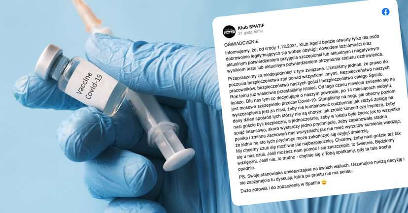 Klub SPATiF w Warszawie, bo właśnie o niego chodzi, poinformował na swoim facebookowym profilu o zmianach funkcjonowania miejsca, na które wypływ miała właśnie obecna sytuacja związana z pandemią. Z oświadczenia możemy dowiedzieć się, że „od środy 1.12.2021, Klub SPATiF będzie otwarty tylko dla osób dobrowolnie legitymujących się wobec obsługi: dowodem tożsamości oraz aktualnym potwierdzeniem przyjęcia szczepionki lub aktualnym i negatywnym wynikiem testu lub aktualnym potwierdzeniem otrzymania statusu ozdrowieńca.”