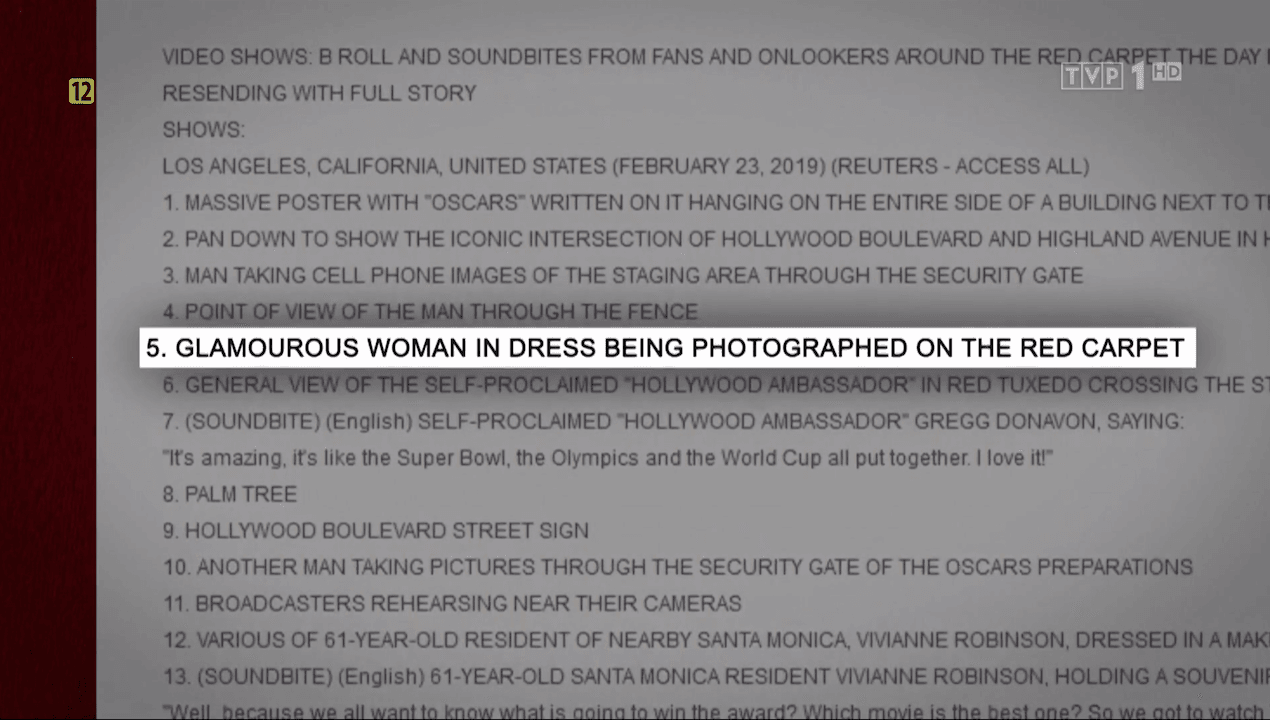 Najmocniejszym dowodem miał być jednak opis nagrania wideo agencji Reuters, gdzie Falzmann wymieniona jest jako "czarująca kobieta w sukience fotografowana na czerwonym dywanie". Problem w tym, że oprócz podanej jako anonimowa osoba dziennikarki na liście są też m.in. plakat, palma i "inny mężczyzna robiący zdjęcie [...]". Oto kadr z Wiadomości TVP: