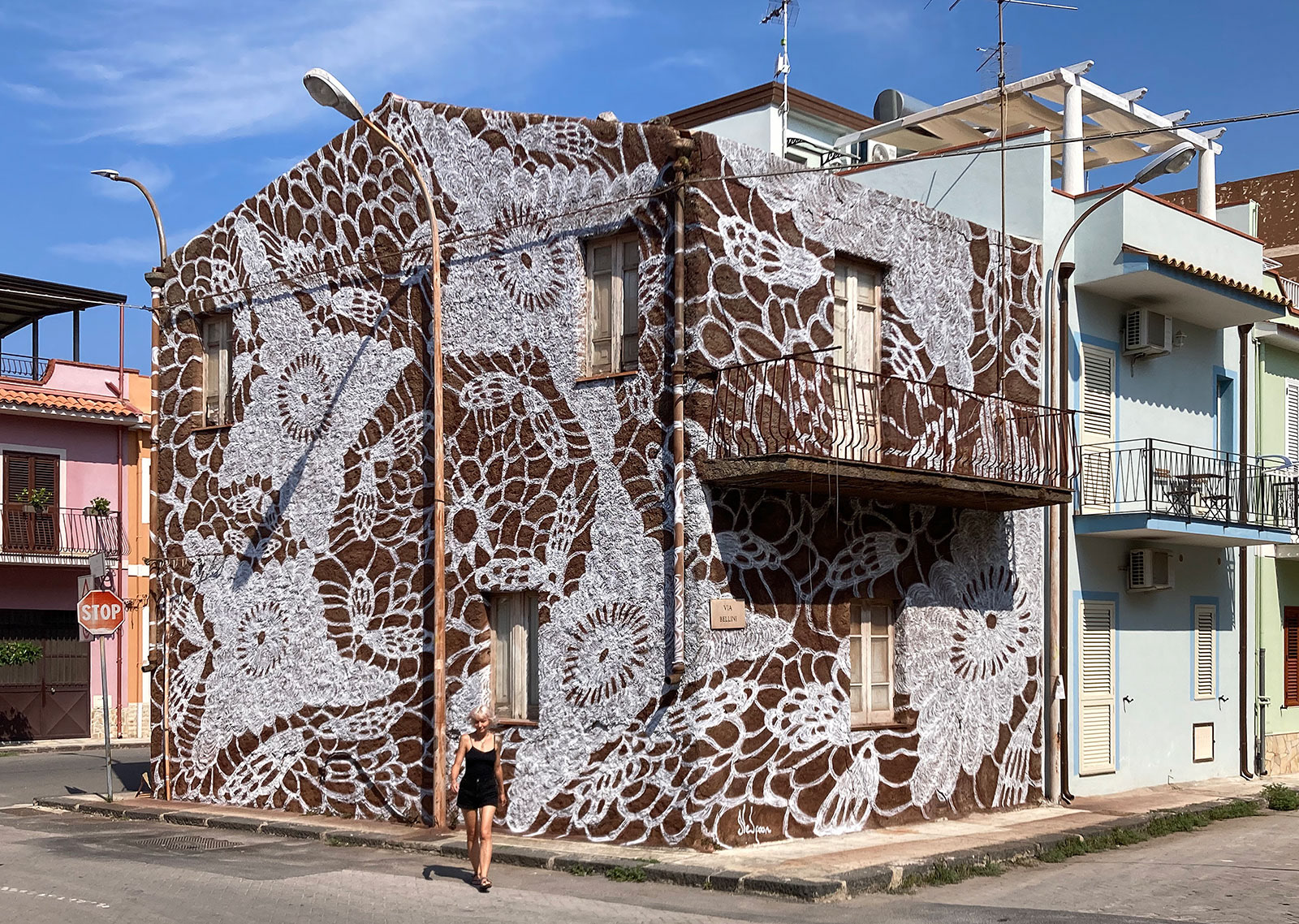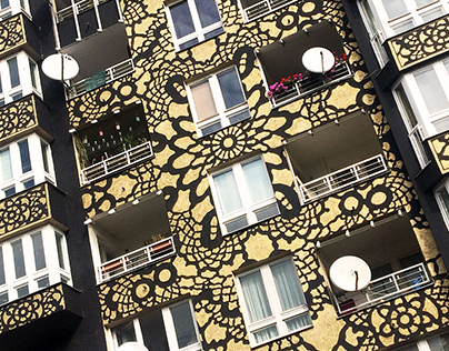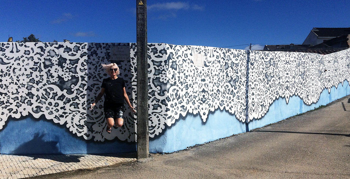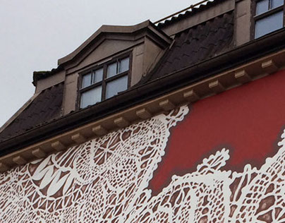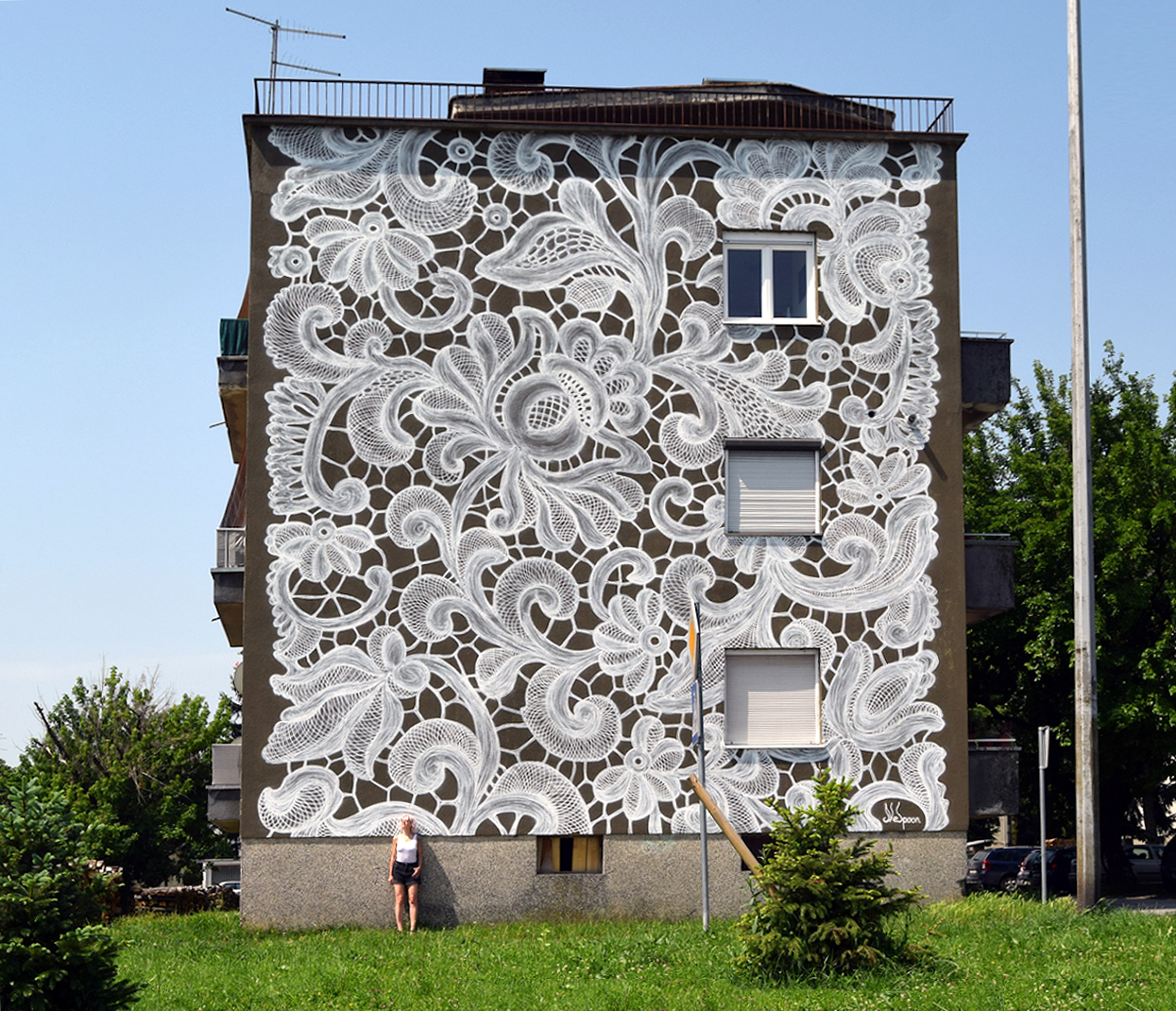 Tak, od A do Z. W środowisku muralistów panuje nawet opinia, że mural nienamalowany własnoręcznie ma wartość wydruku reklamowego. Najpierw pracuję nad projektem, zawsze starając się odnaleźć lokalne wzory koronek, charakterystyczne dla regionu, w którym tworzę. W ten sposób często poznaję miejscowe koronczarki, zwykle starsze kobiety, co jednak od pewnego czasu się zmienia. Następnie ręcznie rysuję i wycinam szablon w skali 1:1, co nieraz równa się nawet kilkuset arkuszom papieru 100x70 centymetrów. Potem jeden po drugim odbijam je na ścianie farbą w spreju i podciągam kolory pędzlem. Mam jednak kilka zasad, których zawsze się trzymam. Między innymi nie zamalowuję graffiti i prac innych artystów, ani nie maluję na ścianach, na których są reklamy i szyldy. W moim domu i na ubraniach zresztą też nie znajdziesz żadnego logotypu, wszystko zrywam lub zaklejam.