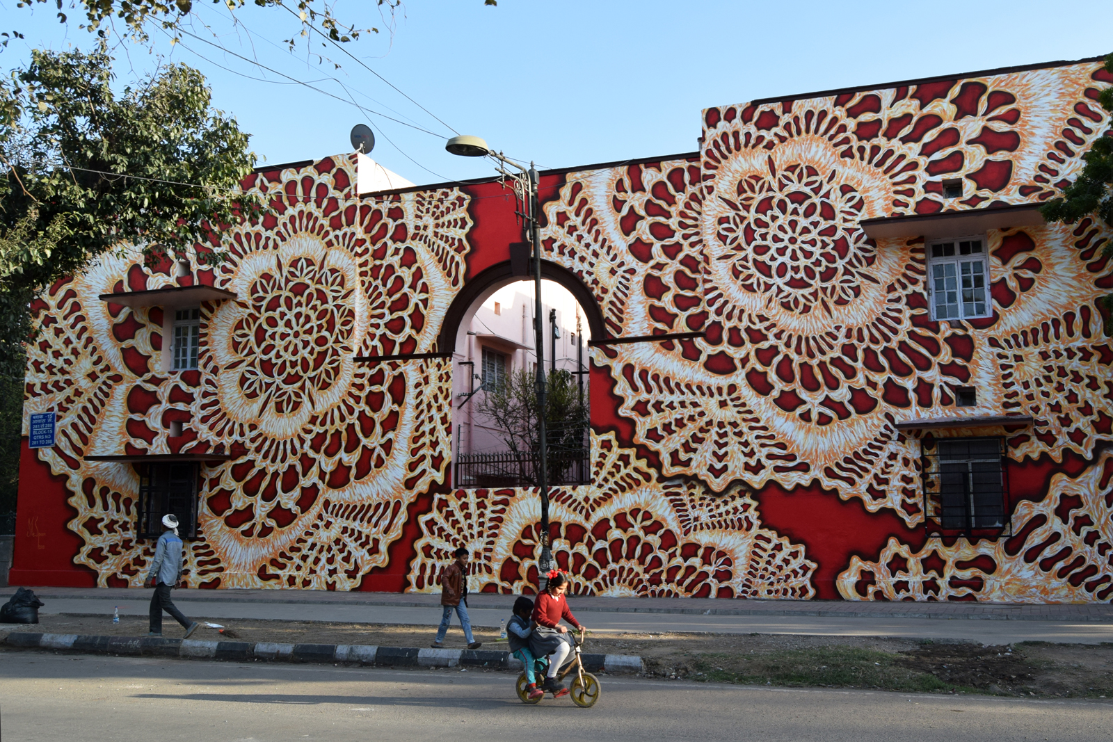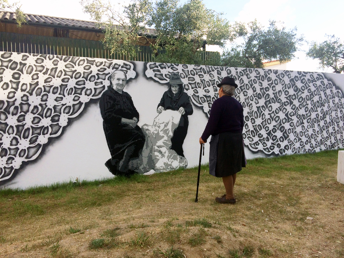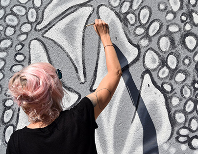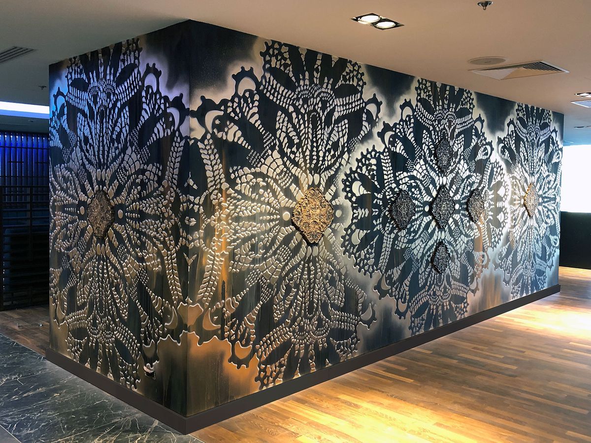 Tak, od A do Z. W środowisku muralistów panuje nawet opinia, że mural nienamalowany własnoręcznie ma wartość wydruku reklamowego. Najpierw pracuję nad projektem, zawsze starając się odnaleźć lokalne wzory koronek, charakterystyczne dla regionu, w którym tworzę. W ten sposób często poznaję miejscowe koronczarki, zwykle starsze kobiety, co jednak od pewnego czasu się zmienia. Następnie ręcznie rysuję i wycinam szablon w skali 1:1, co nieraz równa się nawet kilkuset arkuszom papieru 100x70 centymetrów. Potem jeden po drugim odbijam je na ścianie farbą w spreju i podciągam kolory pędzlem. Mam jednak kilka zasad, których zawsze się trzymam. Między innymi nie zamalowuję graffiti i prac innych artystów, ani nie maluję na ścianach, na których są reklamy i szyldy. W moim domu i na ubraniach zresztą też nie znajdziesz żadnego logotypu, wszystko zrywam lub zaklejam.