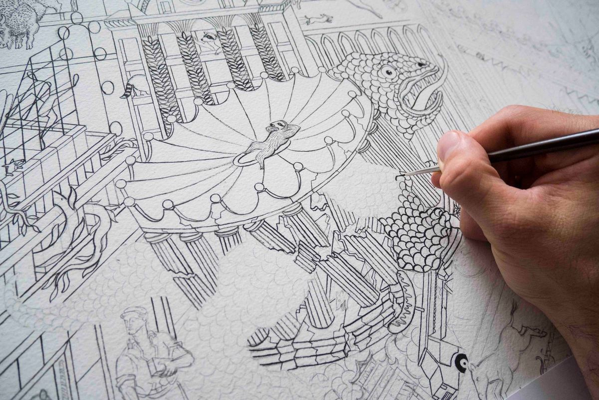 Miałem dwa szkice. Pierwszy, ogólny, o wymiarach 15x15 cm. Zaznaczyłem tam tylko najważniejsze rzeczy, które były narysowane schematycznie. Na drugim szkicu, mającym 30x30 cm, wszystko było dokładnie rozplanowane. Wiedziałem już, gdzie pojawią się główne postacie, jaka będzie kompozycja, osie i wszystkie detale. Finalny projekt stworzyłem w skali 1:1 chusty, czyli 90x90 cm, rysując tuszem oraz malując akwarelą, gwaszem i akrylem. Praca nad rysunkiem trwała dwa i pół miesiąca z przerwami. Następnie rysunek był skanowany, fotografowany i przez kolejne miesiące przerysowywany do druku – wówczas separowano i dobierano kolory. Kolejne miesiące zajął druk w Lyonie. Cały proces powstawania chusty do momentu pojawienia się w sprzedaży zajął mniej więcej półtora roku. Animapolis jest dostępna w dziesięciu wersjach kolorystycznych – „multikolor” jest najbliższa kolorystyce oryginalnego rysunku, liczy około pięćdziesięciu kolorów drukowanych sitodrukiem. Przy chustach z kolekcji damskiej mam przyjemność pracować z Bali Barret, szefową kolekcji damskiej, oraz Christine Duvigneau.