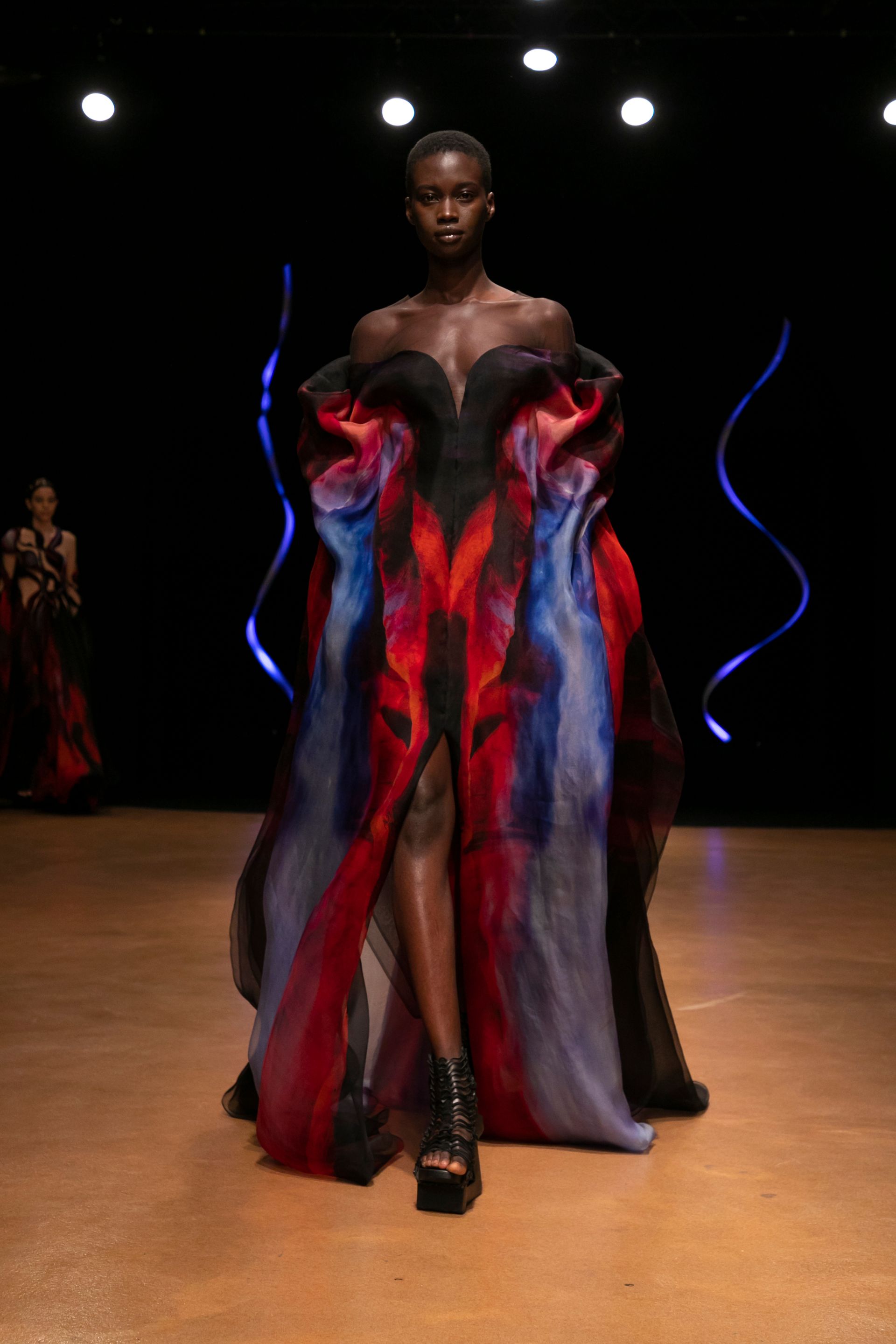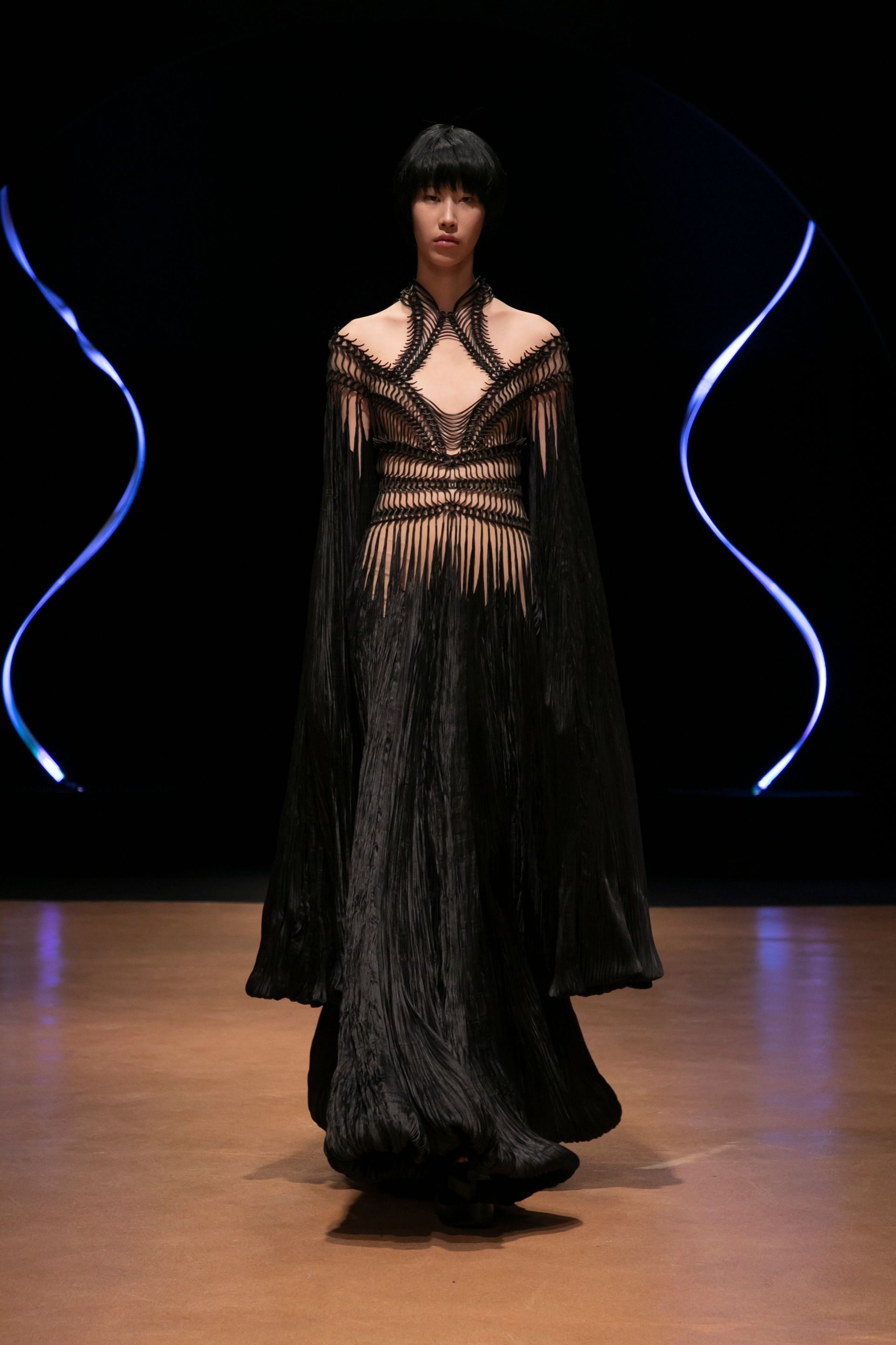 Potencjał szkiców Cajala ujawnia technika „labrynthine” – jedna ze specjalności domu van Herpen. Laserowo wycięte jedwabne dendryty pokryły się tu listkami czarnej, półprzeźroczystej organzy, które zostały ręcznie wyszyte na perłowych szkieletach zewnętrznych.