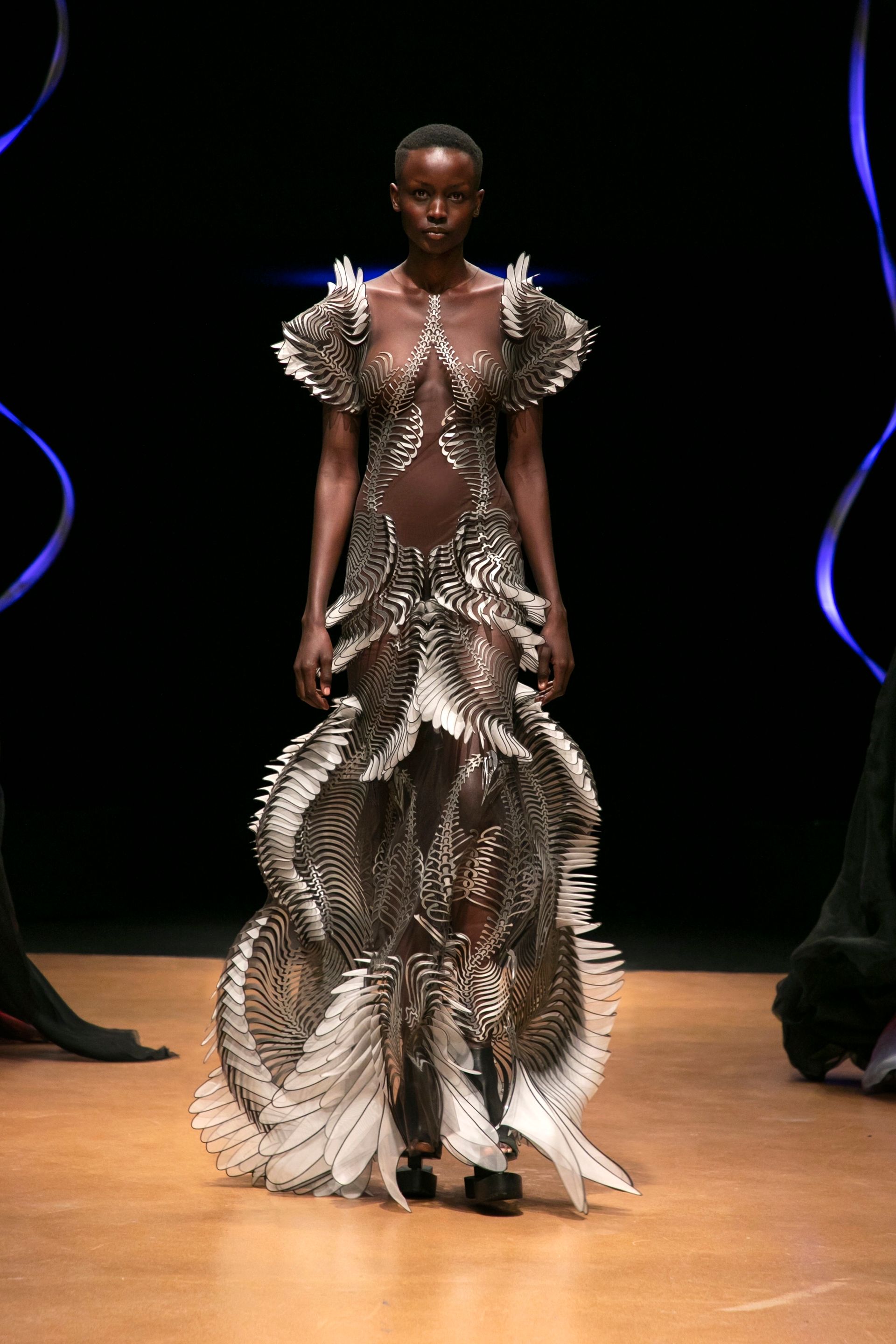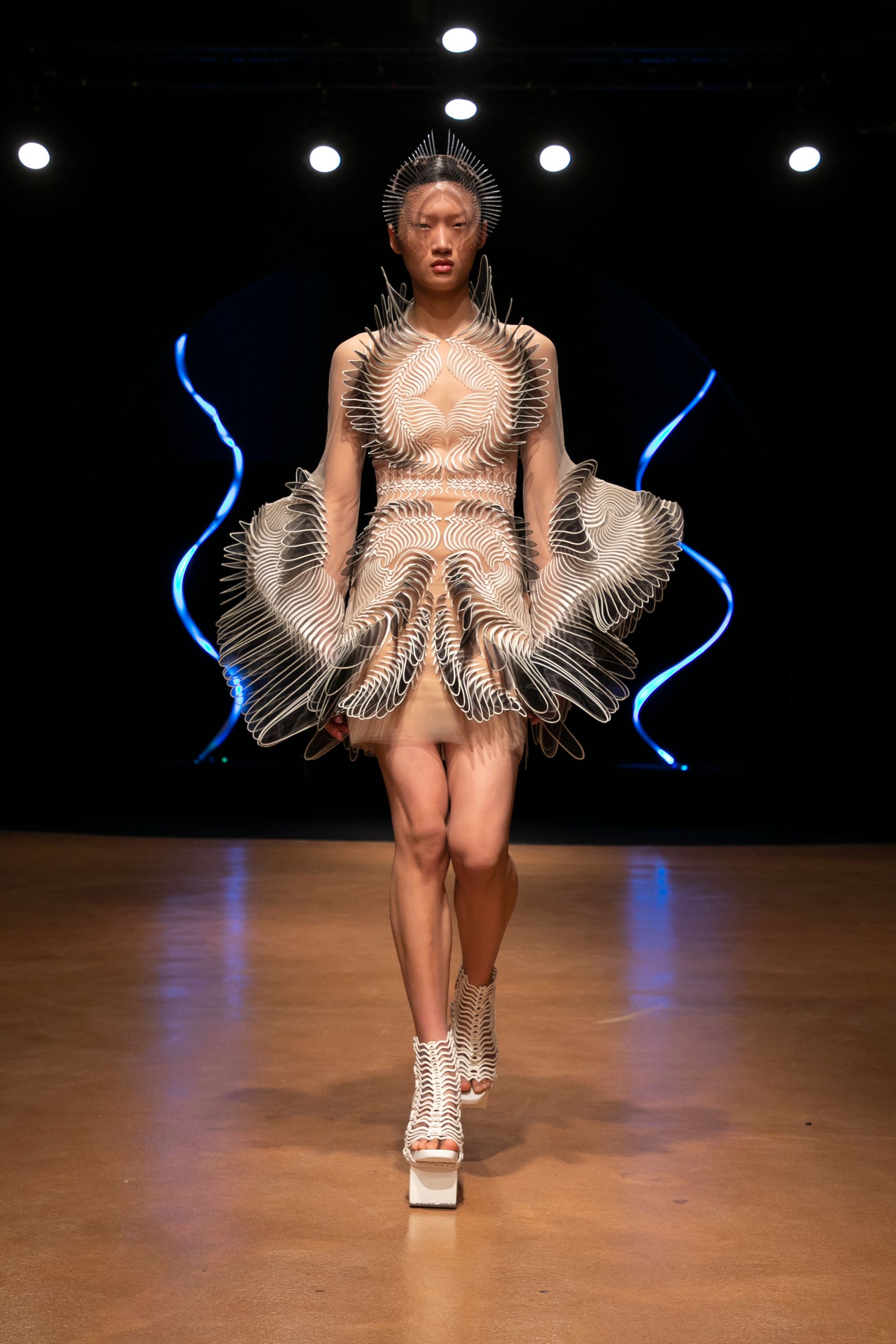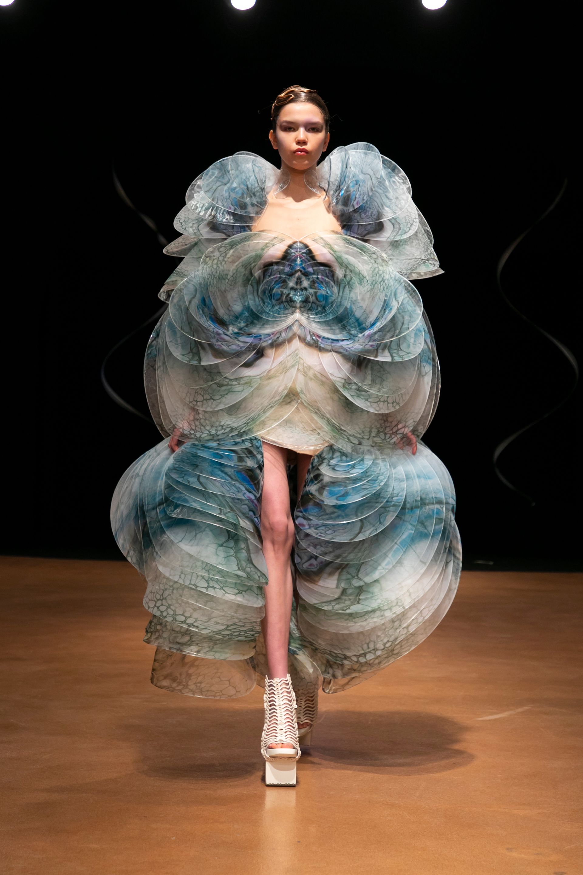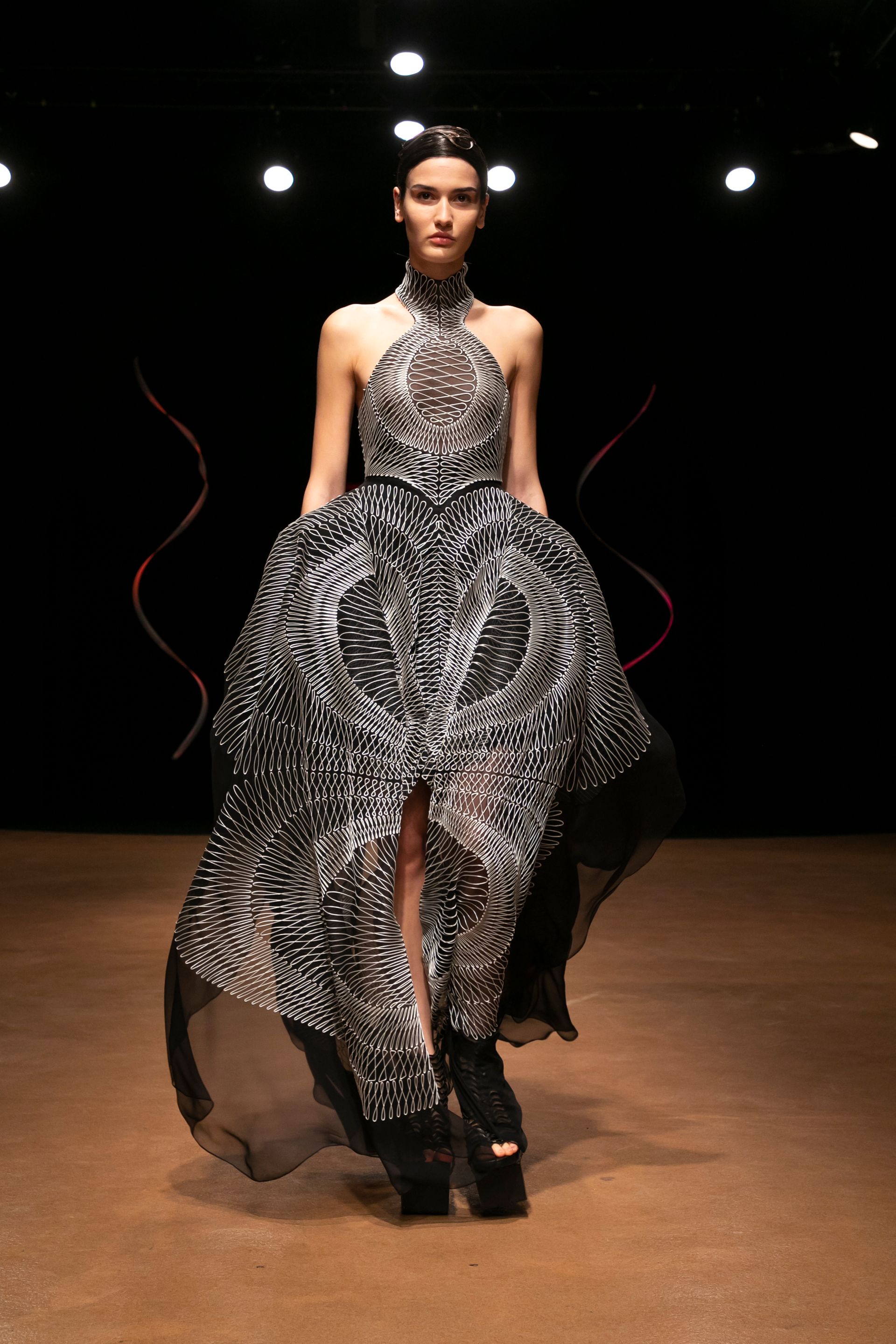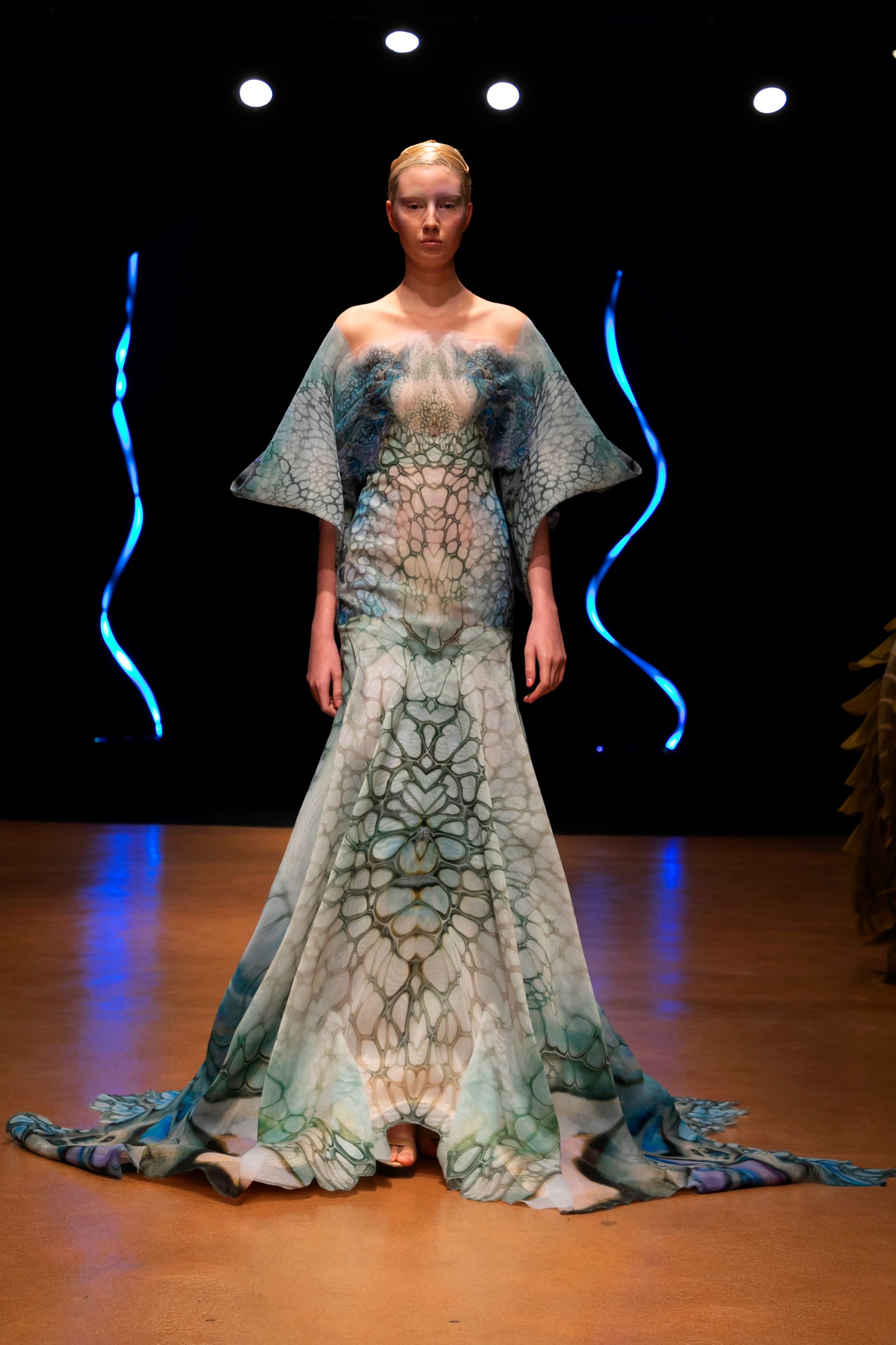 Niektóre trójwymiarowo skręcające się modele sukni zaprojektowanezostały w programie komputerowym. Tysiące białych siateczek do sitodruku ponumerowanoi podzielonona kawałeczki oddzielone od siebie o 3 milimetry, a potemlaserowo pocięto na jeszcze drobniejsze struktury. Maszyna musiała być szalenie precyzyjne, by nie przepalić żadnego elementu oraz sprawić, żeby materiał zachowywał się w pożądany sposób. Każda warstwa została następnie ręcznie opatrzona miniaturowymi transparentnymi jodełkami, tworząc koralową strukturę wspinającą się po ciele.