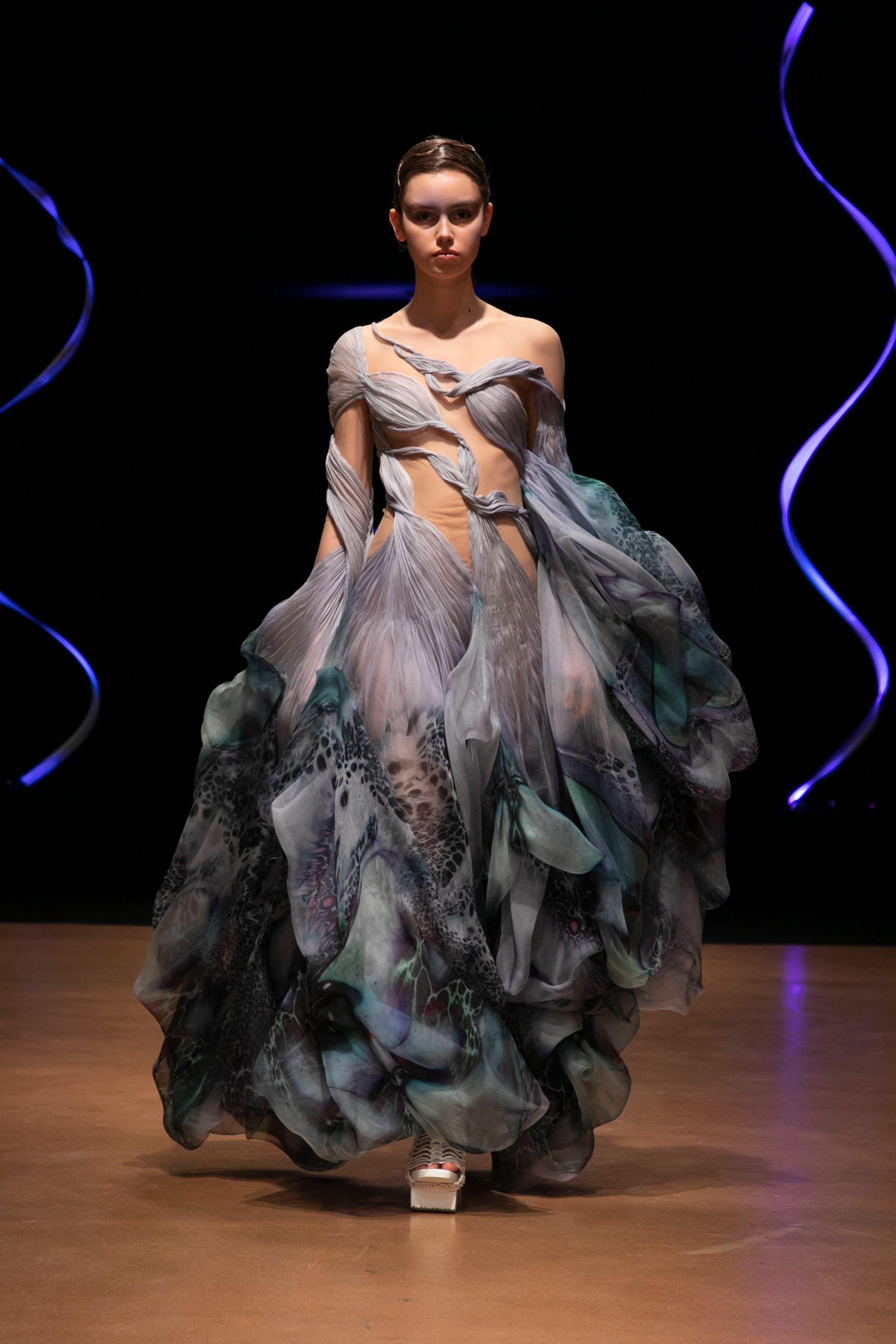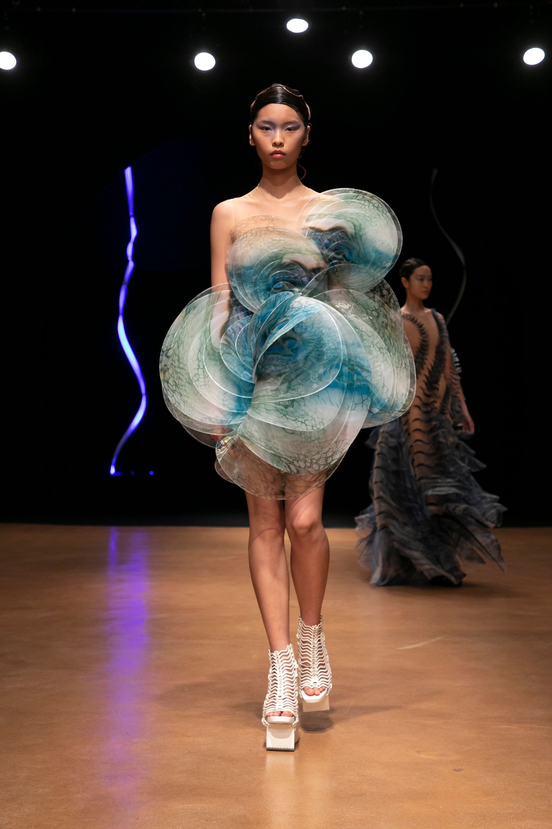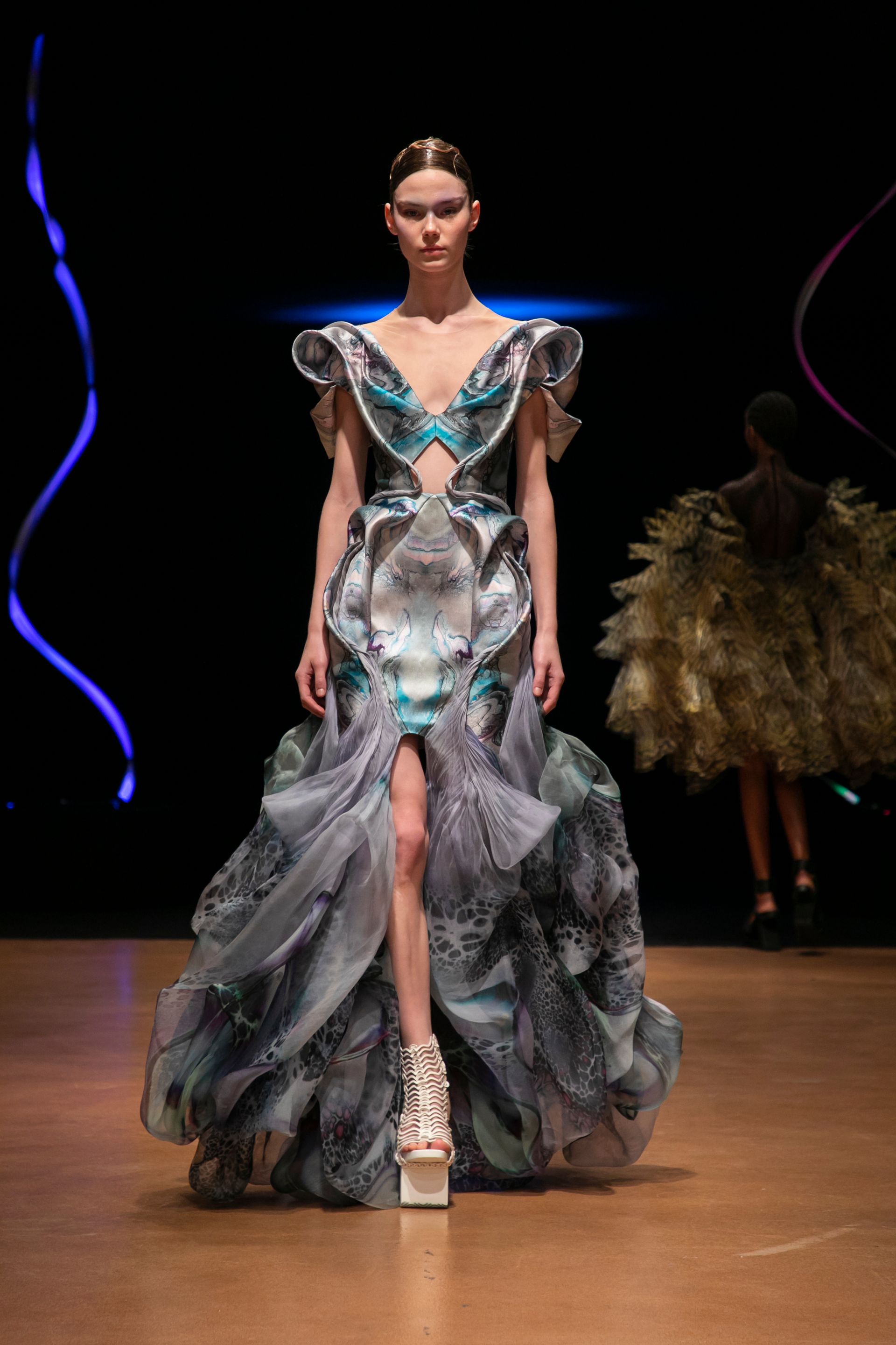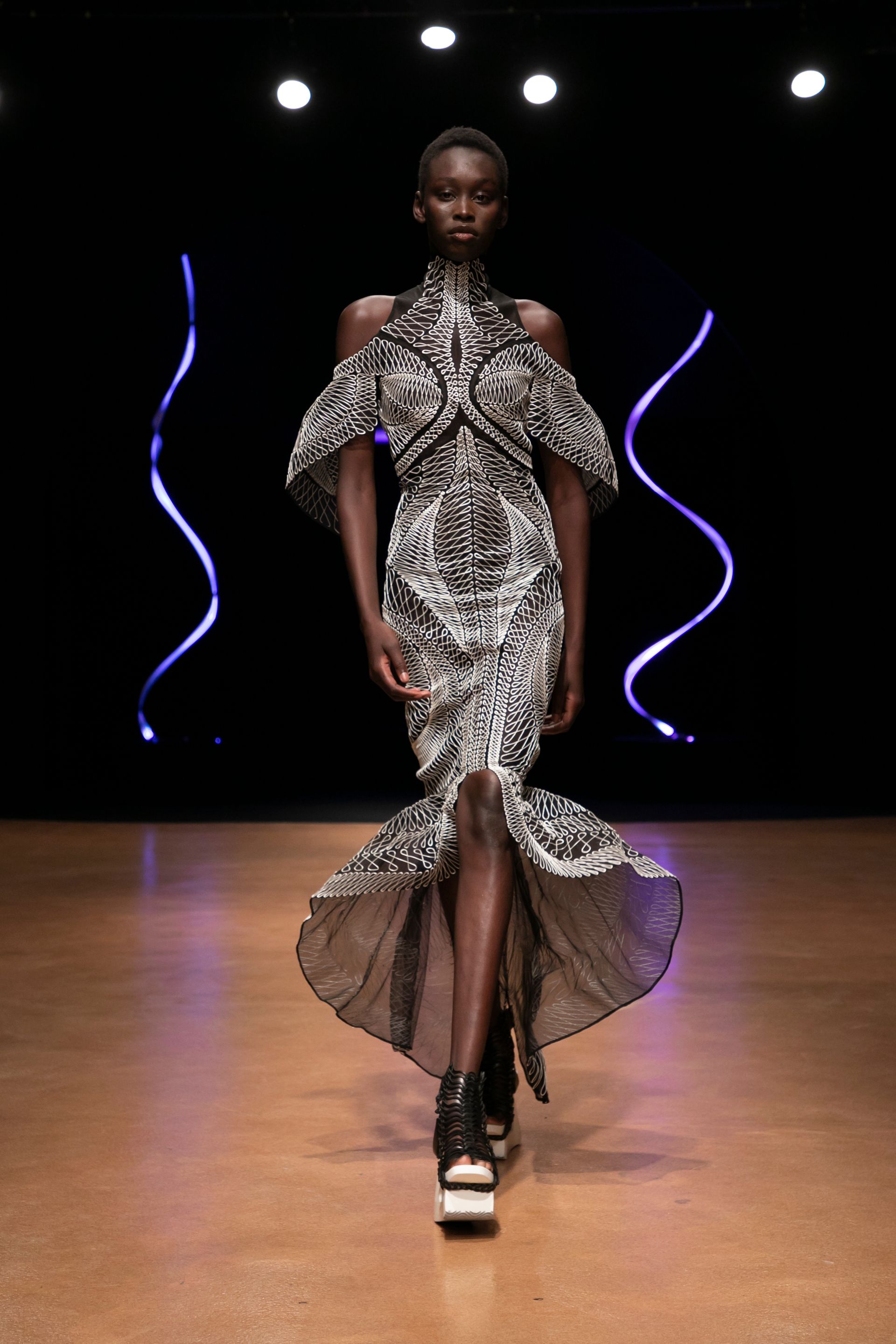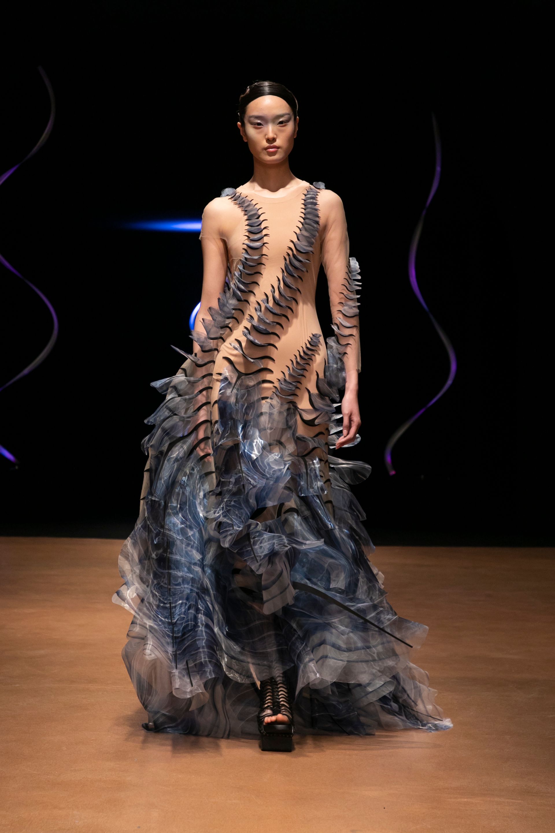 Niektóre trójwymiarowo skręcające się modele sukni zaprojektowanezostały w programie komputerowym. Tysiące białych siateczek do sitodruku ponumerowanoi podzielonona kawałeczki oddzielone od siebie o 3 milimetry, a potemlaserowo pocięto na jeszcze drobniejsze struktury. Maszyna musiała być szalenie precyzyjne, by nie przepalić żadnego elementu oraz sprawić, żeby materiał zachowywał się w pożądany sposób. Każda warstwa została następnie ręcznie opatrzona miniaturowymi transparentnymi jodełkami, tworząc koralową strukturę wspinającą się po ciele.