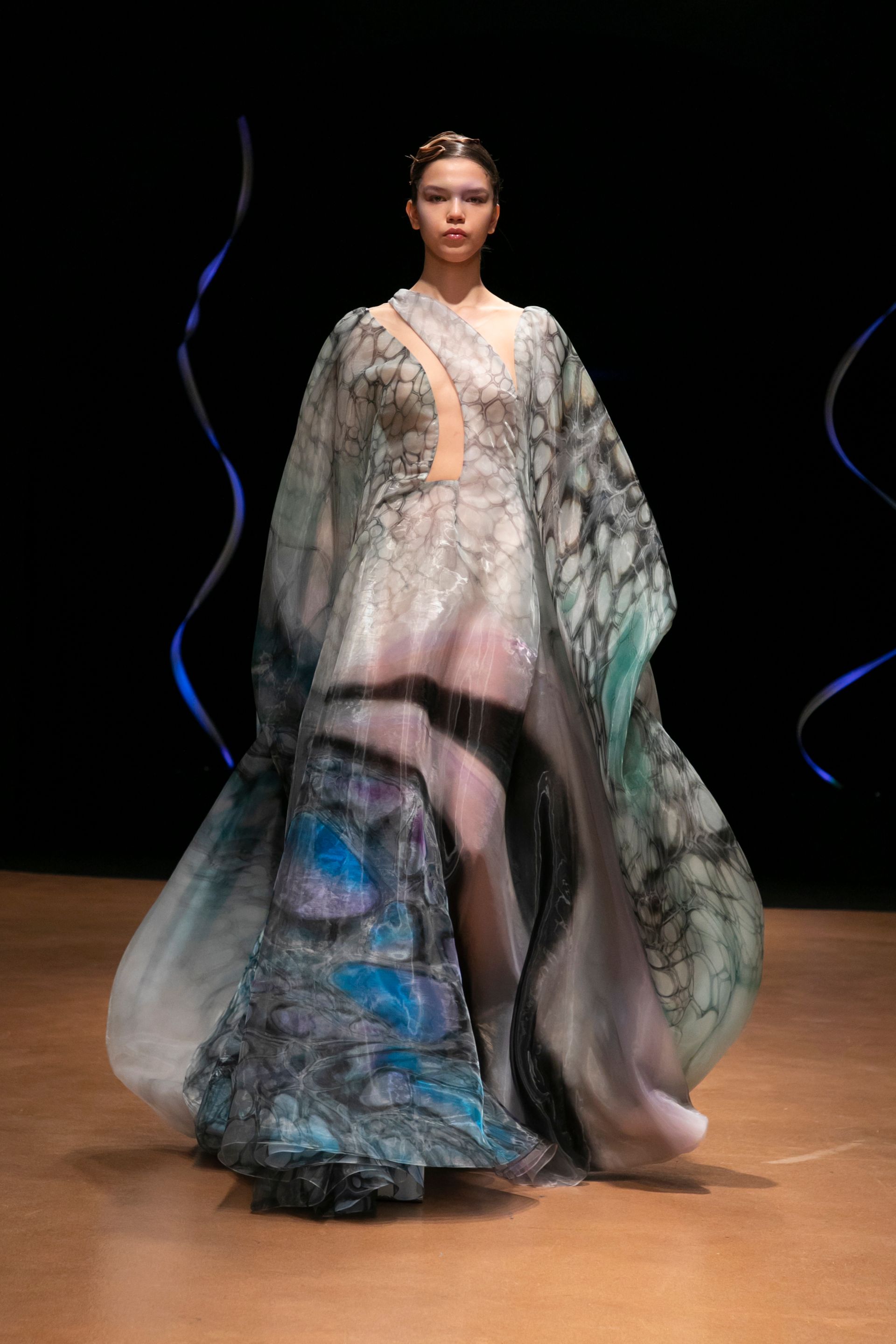 Imitując neuronalne i morskie pływy, mieniące się jedwabie zamaszyście powiewały po wybiegu. A to dopiero czubek góry lodowej. W końcu Iris van Herpen znana jest z zaawansowanych rozwiązań technicznych, które tym razem pozwoliły widzom doświadczyć immersji oceanu i cichego, choć nieustającego trajkotania naszych zmysłów.
