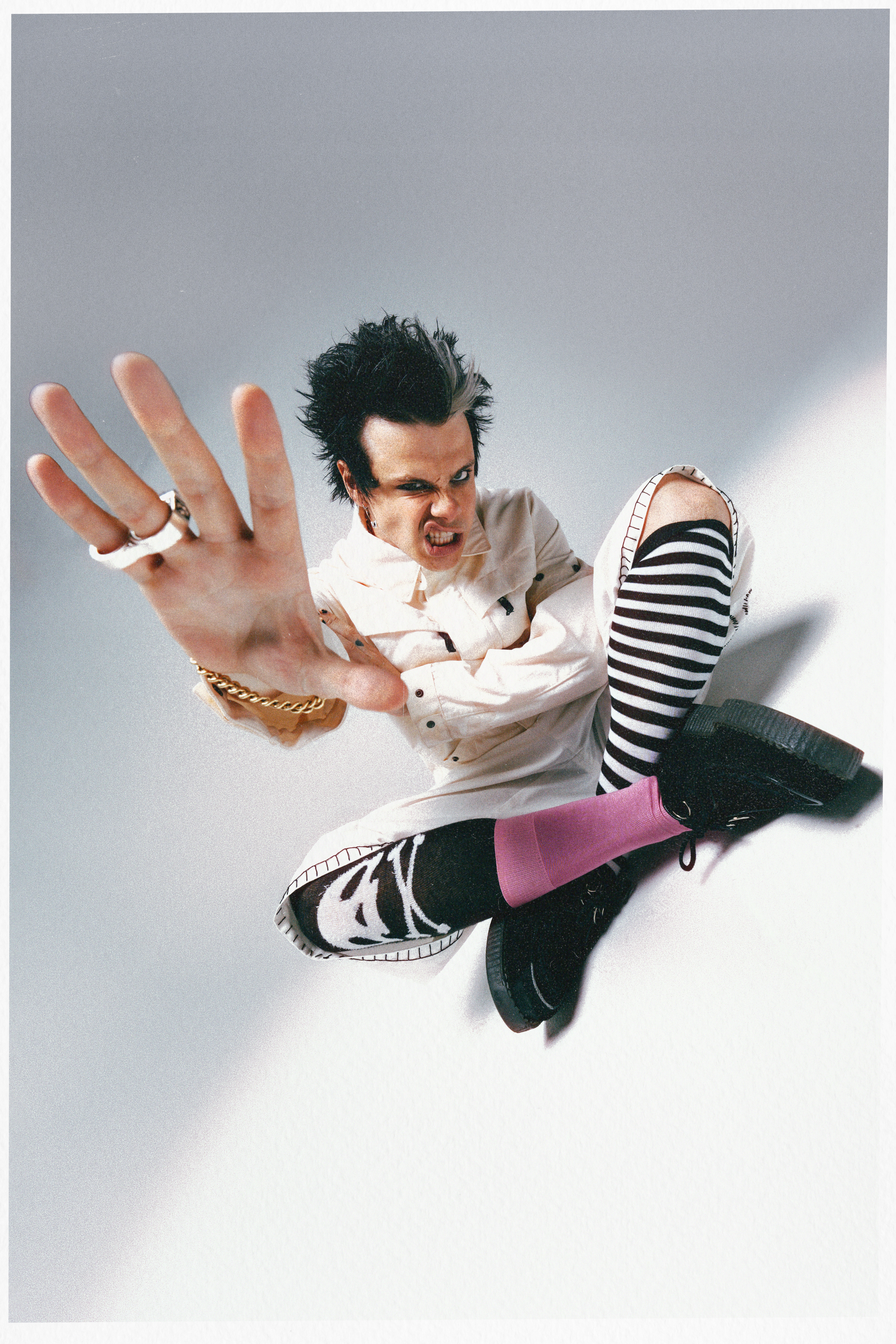 Obdrapany czarny lakier na paznokciach, niechlujnie obrysowane ciemną kredką powieki, skórzane ogrodniczki i zapięta na szyi kłódka będąca wyznaniem miłości – prezentem od dziewczyny, amerykańskiej artystki Jesse Jo Stark, z którą jest już od kilku lat.
