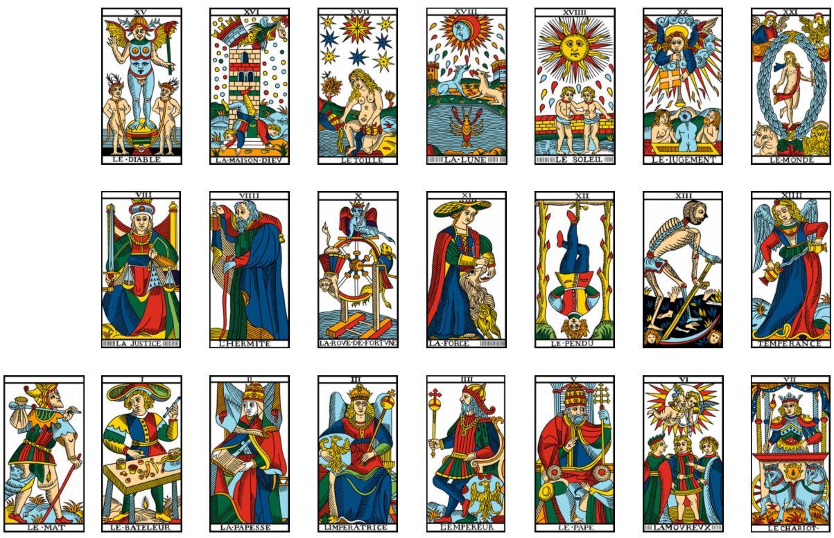 Analiza najstarszych wizerunków Tarota wskazuje jednak, że jego XV-wieczni twórcy czerpali inspiracje także z innych źródeł. Na kartach odnajdujemy bowiem alegorie występujące w malarstwie dewocyjno-kościelnym (Papież, Diabeł, Sąd Ostateczny, niektóre przedstawienia Świata), w obrazach mitologiczno-biblijnych (Wieża Babel lub Rydwan, nawiązujący do wizji proroka Ezechiela), w literaturze moralnej i łotrzykowskiej (Moc, Kochankowie, Koło Fortuny, Umiarkowanie, Sprawiedliwość, Śmierć, Wisielec, Głupiec, Mag), a także na rycinach astrologicznych (Gwiazda, Księżyc, Słońce) i alchemicznych (Cesarz, Cesarzowa). Ich dobór wydaje się zatem przypadkowy i znaczeniowo niespójny, a co gorsza, wcale nie jesteśmy pewni, czy dokonana przez nas identyfikacja tych alegorii jest prawidłowa. Owszem, Moc wygląda jak symbol Wstrzemięźliwości, lecz zarazem jest podobna do alchemicznego wyobrażenia Lwa symbolizującego jeden z etapów wytwarzania kamienia filozoficznego. Diabeł jest oczywiście diabłem, ale znajduje również odbicie w hermetycznym symbolu Lucyferycznej Trójcy. Karta VIII mogłaby uosabiać cnotę Sprawiedliwości, ale kojarzy się też z zodiakiem Wagi. Umiarkowanie – a w XVII-wiecznych tarotach także Gwiazda – zdaje się świetnie korelować z astrologicznym przedstawieniem Wodnika. Aż w końcu – kogo reprezentuje trzymająca w dłoniach księgę Papieżyca? Matkę Kościół? Papiestwo? Papieżycę Joannę? Gnozę? Mądrość? A może herezję?