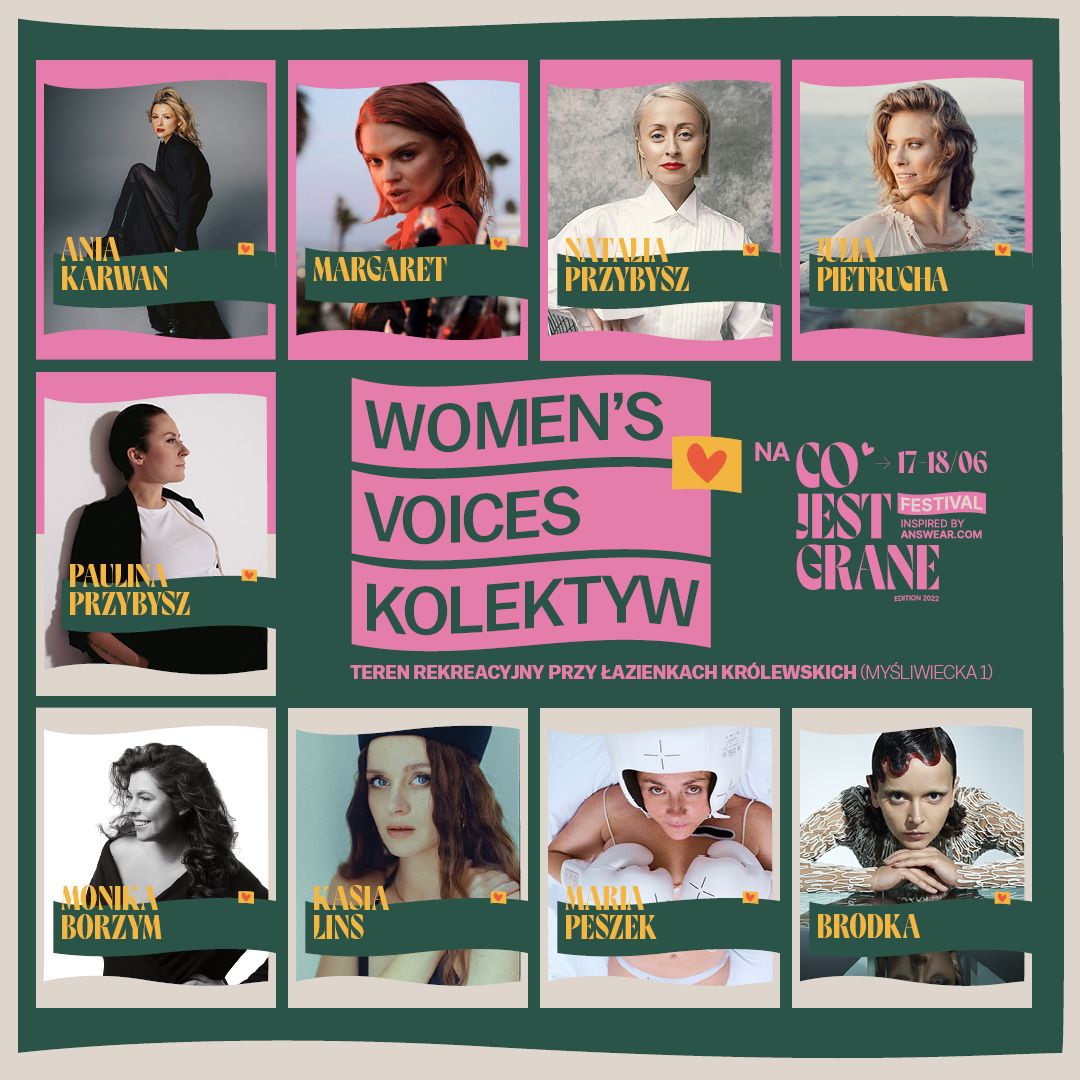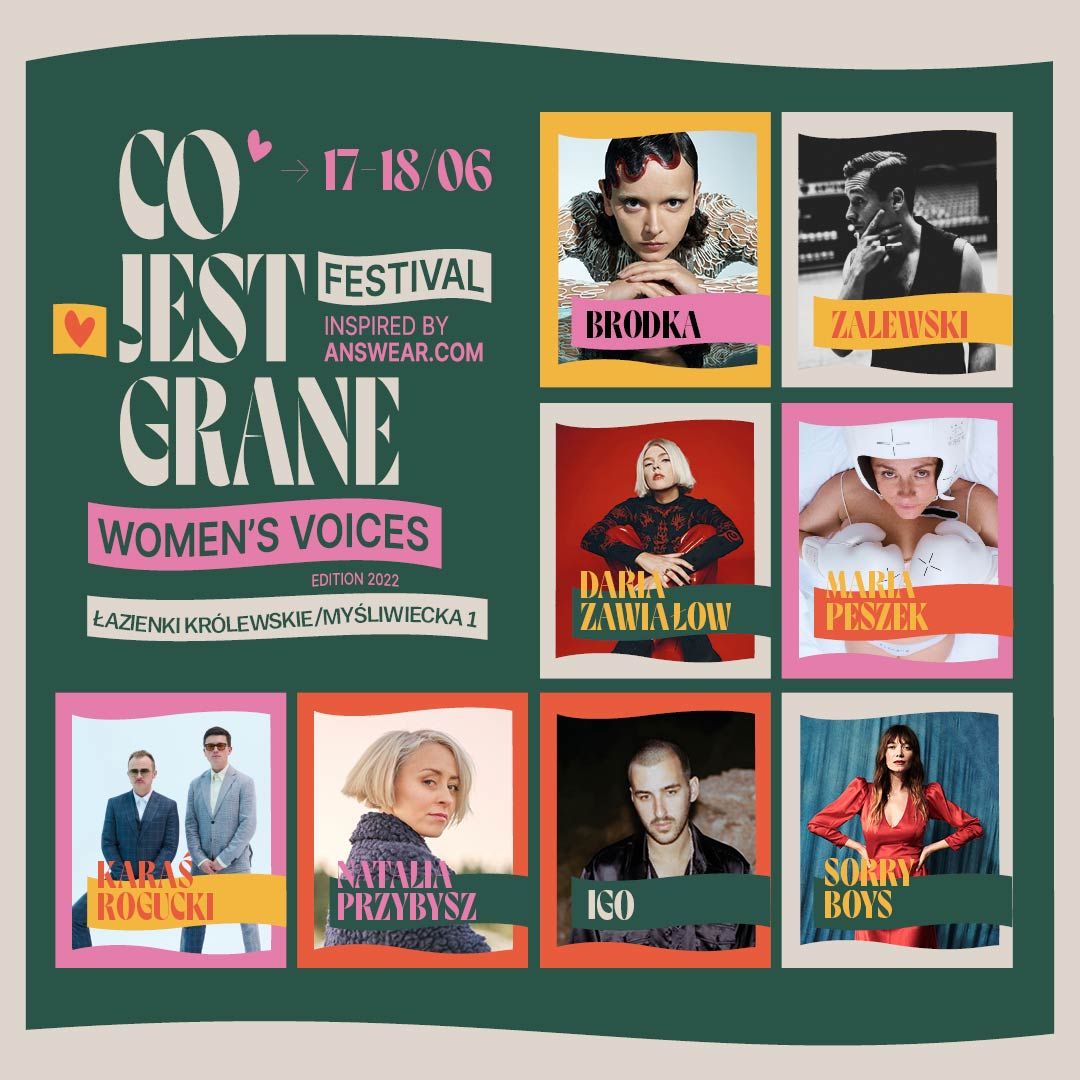 Dla publiczności zagrają: Brodka, Daria Zawiałow, Maria Peszek, Zalewski, Natalia Przybysz, Karaś/Rogucki, Sorry Boys i Igo. Stery nad tegoroczną edycją, zarówno na scenie, jak i poza nią, przejmą kobiety. Począwszy od wyboru repertuaru, scenografii, aż po finałowe koncerty, festiwal znajdzie się w mocy i w rękach wyjątkowych artystek. Tylko na Co Jest Grane Festival będzie można usłyszeć głosy: Pauliny Przybysz, Moniki Borzym, Brodki, Ani Karwan, Kasi Lins, Margaret, Marii Peszek, Julii Pietruchy i Natalii Przybysz, zebrane w niepowtarzalny Women’s Voices Kolektyw.