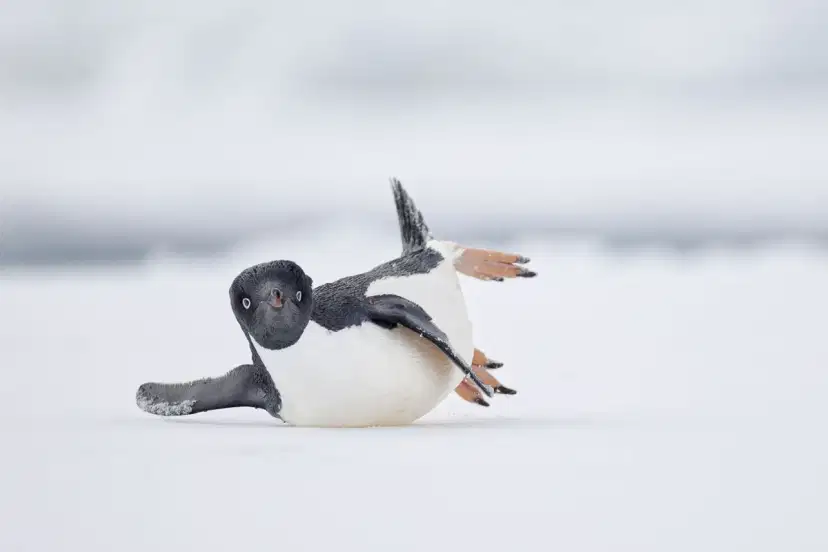 Komediowe Zdjęcie Ptaków: Złotą nagrodę zdobyła Nadia Haq (USA) za zabawne ujęcie pingwina Adeli zjeżdżającego na brzuchu po lodzie w Antarktyce.